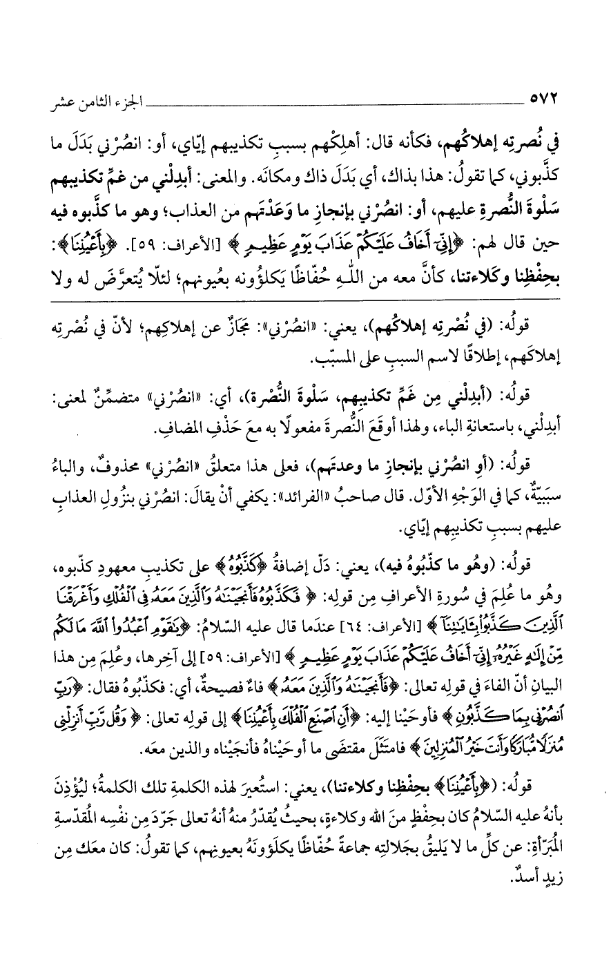 في نصرته إهلاكهم، فكأنه قال: أهلكهم بسبب تكذيبهم إياى، أو انصرني بدل ما كذبوني، كما تقول: هذا بذاك، أى بدل ذاك ومكانه. والمعنى: أبدلنى من غمّ تكذيبهم، سلوة النصرة عليهم. أو انصرني بإنجاز ما وعدتهم من العذاب، وهو ما كذبوه فيه حين قال لهم (إِنِّي أَخافُ عَلَيْكُمْ عَذابَ يَوْمٍ عَظِيمٍ)] الأعراف: 59 [. (بِأَعْيُنِنا) بحفظنا وكلاءتنا، كأن معه من الله حفاظا يكلئونه بعيونهم، لئلا يتعرض له ولا