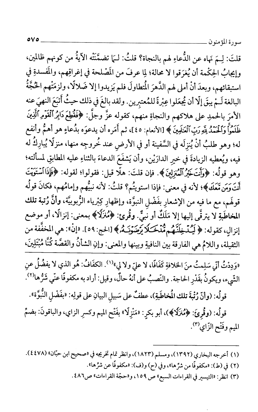 قلت: لم نهاه عن الدعاء لهم بالنجاة؟ قلت: لما تضمنته الآية من كونهم ظالمين، وإيجاب الحكمة أن يغرقوا لا محالة، لما عرف من المصلحة في إغراقهم، والمفسدة في استبقائهم، وبعد أن أملى لهم الدهر المتطاول فلم يزيدوا إلا ضلالا، ولزمتهم الحجة البالغة لم يبق إلا أن يجعلوه عبرة للمعتبرين. ولقد بالغ في ذلك حيث أتبع النهى عنه، الأمر بالحمد على هلاكهم والنجاة منهم، كقوله عز وجل (فَقُطِعَ دابِرُ الْقَوْمِ الَّذِينَ ظَلَمُوا وَالْحَمْدُ لِلَّهِ رَبِّ الْعالَمِينَ)] الأنعام: 45 [، ثم أمره أن يدعوه بدعاء هو أهم وأنفع له، وهو طلب أن ينزله في السفينة أو في الأرض عند خروجه منها، منزلا يبارك له فيه ويعطيه الزيادة في خير الدارين، وأن يشفع الدعاء بالثناء عليه المطابق لمسألته، وهو قوله (وَأَنْتَ خَيْرُ الْمُنْزِلِينَ). فإن قلت: هلا قيل: فقولوا، لقوله (فَإِذَا اسْتَوَيْتَ أَنْتَ وَمَنْ مَعَكَ) لأنه في معنى: فإذا استويتم؟ قلت: لأنه نبيهم وإمامهم، فكان قوله قولهم، مع ما فيه من الإشعار بفضل النبوّة وإظهار كبرياء الربوبية، وأن رتبة تلك المخاطبة لا يترقى إليها إلا ملك أو نبىّ. وقرئ: (منزلا)، بمعنى إنزالا، أو موضع إنزال، كقوله: (ليدخلنهم مدخلا يرضونه)] الحج: 59 [. "إِنَّ" هي المخففة من الثقيلة، واللام هي الفارقة بين النافية وبينها في المعنى، وإن الشأن والقصة كُنَّا َمُبْتَلِينَ،
