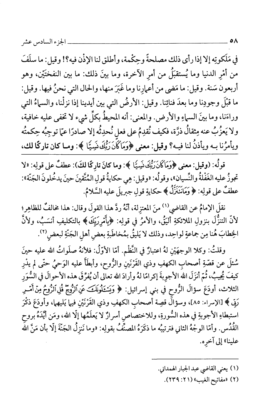 قوله: (وقيل: معنى (وَمَا كَانَ رَبُّكَ نَسِيّاً): وما كان تاركاً لك): عطفٌ على قوله: "لا تجوز عليه الغفلة والنسيان"، وقوله: "وقيل: هي حكاية قول المتقين حين يدخلون الجنة": عطفٌ على قوله: (وَمَا نَتَنَزَّلُ) حكاية قول جبريل عليه السلام.