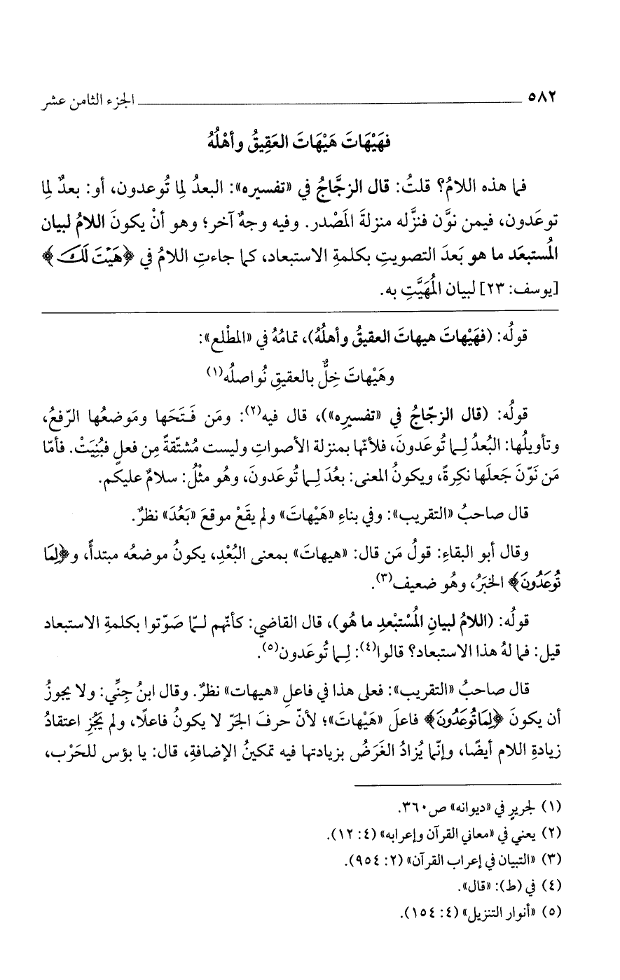 قوله: (قال الزجاج في "تفسيره")، قال فيه: من فتحها وموضعها الرفعُ، وتأويلها: البعد لما تُوعدون، فلأنها بمنزلة الأصوات وليت مشتقة من فعل فبُنيت. فأما من نون جعلها نكرةً، ويكونُ المعنى: بعُد لما تُوعدون، وهو مثلُ: سلامٌ عليكم.