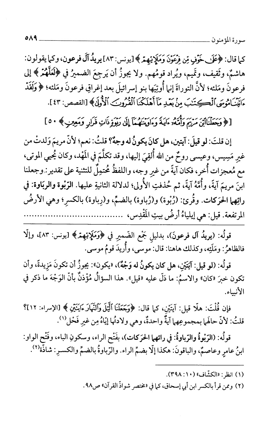فإن قلت: لو قيل آيتين هل كان يكون له وجه؟ قلت: نعم، لأنّ مريم ولدت من غير مسيس، وعيسى روح من الله ألقى إليها، وقد تكلم في المهد وكان يحيى الموتى مع معجزات أخر، فكان آية من غير وجه، واللفظ محتمل للتثنية على تقدير وَجَعَلْنَا ابْنَ مَرْيَمَ آية وَأُمَّهُ آية ثم حذفت الأولى لدلالة الثانية عليها. الربوة والرباوة في رائهما الحركات. وقرئ: (ربوة) و (رباوة)، بالضم. و (رباوة) بالكسر وهي الأرض المرتفعة. قيل: هي إيليا أرض بيت المقدس، ........
