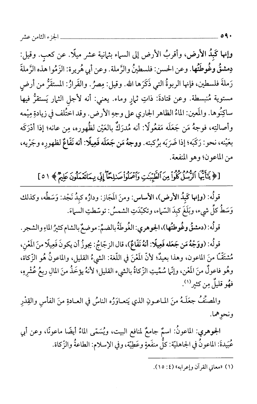 قوله: (ووجه من جعله فعيلاً: أنه نفاعٌ)، قال الزجاج: يجوز أنيكون فعيلاً من المعن، مشتقاً من الماعون، وهذا بعيدٌ؛ لأن المعن في اللغة: الشيء القليل، والماعونُ هو الزكاة، وهو فاعولٌ من المعن، وإنما سُميت الزكاةُ بالشيء القليل؛ لأنه يؤخذُ من المال ربعُ عُشره، فهو قليلٌ من كثير.