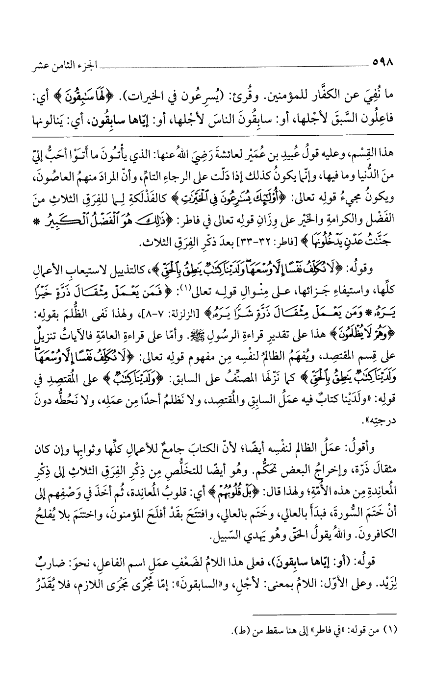 هذا القسم، وعليه قول عبيد بن عمير لعائشة رضي الله عنها: الذي يأتون ما أتوا أحبُّ إليّ من الدنيا وما فيها، وإنما يكون كذلك إذا دلت على الرجاء التام، وأن المراد منهم العاصون، ويكون مجيء قوله تعالى: (أُوْلَئِكَ يُسَارِعُونَ فِي الْخَيْرَاتِ) كالفذلكة لما للفرق الثلاث من الفضل والكرامة والخير على وزان قوله تعالى في فاطر: (ذَلِكَ هُوَ الْفَضْلُ الْكَبِيرُ * جَنَّاتُ عَدْنٍ يَدْخُلُونَهَا) [فاطر: 32 - 33] بعد ذكر الفرق الثلاث.