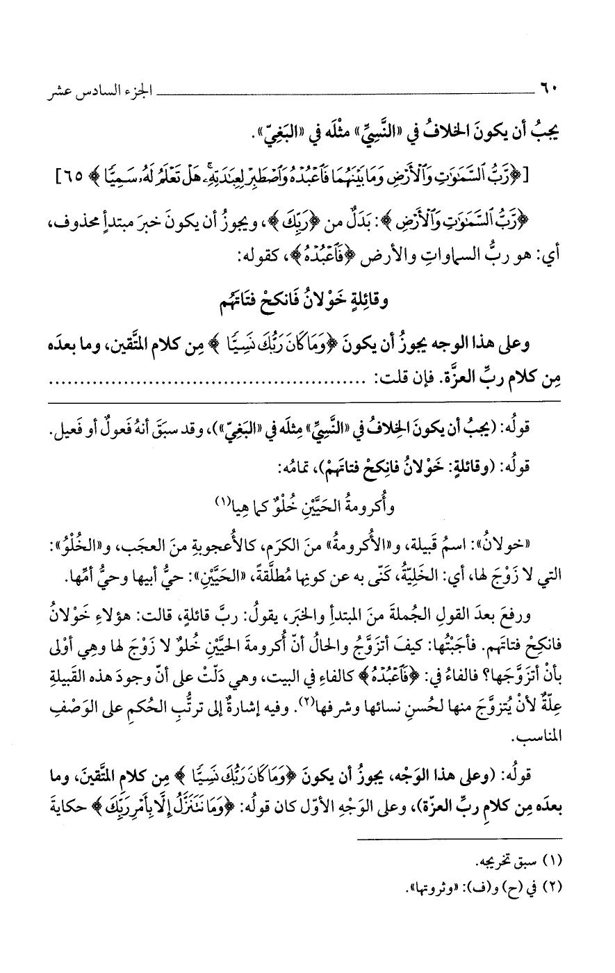 قوله: (وعلى هذا الوجه، يجوز أن يكون (وَمَا كَانَ رَبُّكَ نَسِيّاً) من كلام المتقين، وما بعده من كلام رب العزة)، وعلى الوجه كان قوله: (وَمَا نَتَنَزَّلُ إِلاَّ بِأَمْرِ رَبِّكَ) حكاية