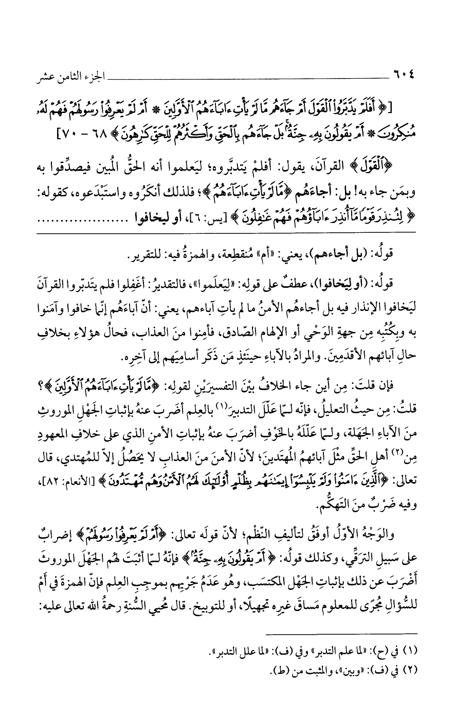 والوجه الأول أوفق لتأليف النظم؛ لأن قوله تعالى: (أَمْ لَمْ يَعْرِفُوا رَسُولَهُمْ) إضرابٌ على سبيل الترقي، وكذلك قوله: (أَمْ يَقُولُونَ بِهِ جِنَّةٌ) فإنه لما أثبت لهم الجهل الموروث أضرب عن ذلك بإثبات الجهل المكتسب، وهو عدم جريهم بموجب العلم فإن الهمزة في أم للسؤال مُجرى للمعلوم مساق غيره تجهيلاً، أو للتوبيخ. قال محيي السنة رحمة الله تعالى عليه: