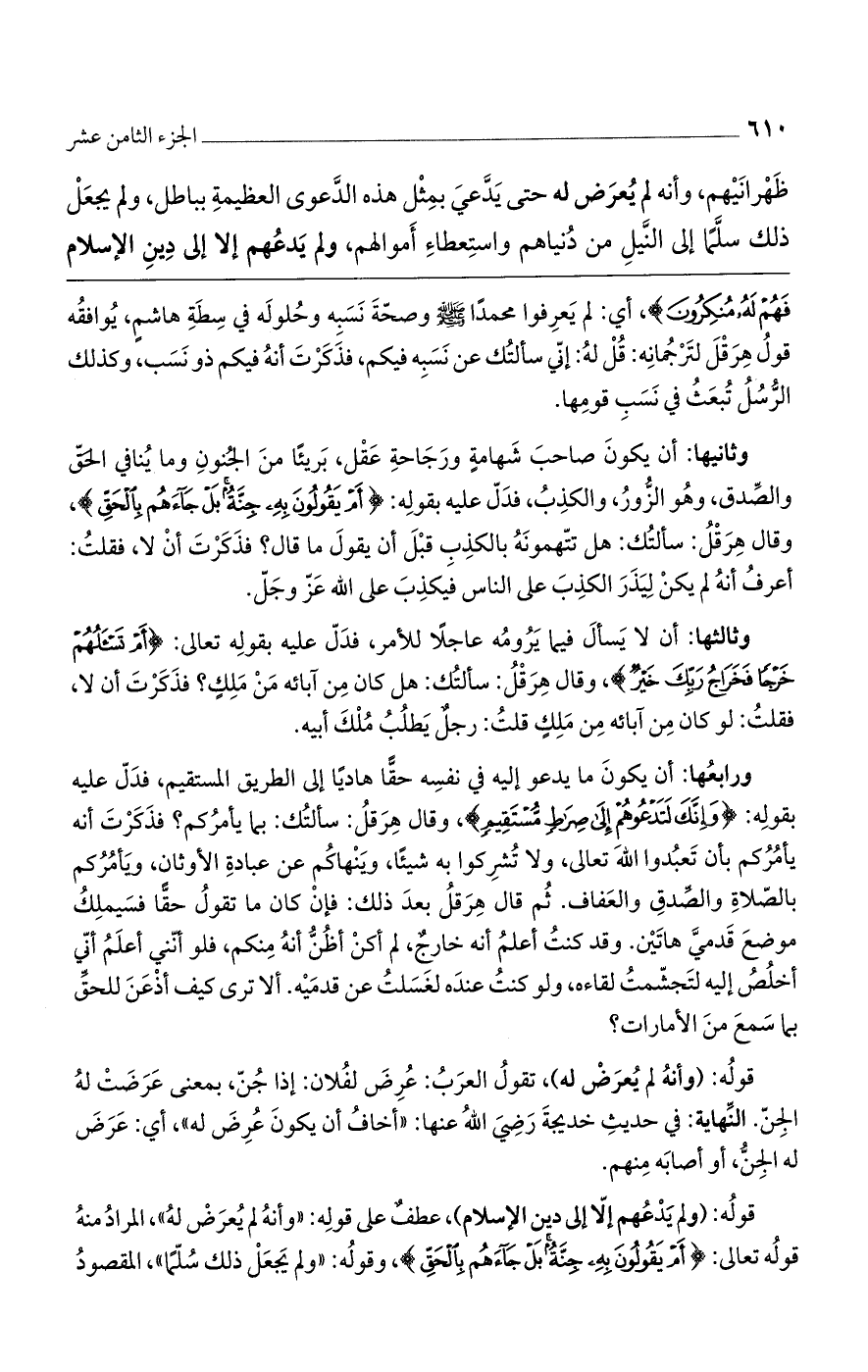 وثانيها: أن يكون صاحب شهامة ورجاحة عقل، بريئاً من الجنون وما ينافي الحق والصدق، وهو الزورُ، والكذب، فدل عليه بقوله: (أَمْ يَقُولُونَ بِهِ جِنَّةٌ بَلْ جَاءَهُمْ بِالْحَقِّ)، وقال هرقل: سألتك: هل تتهمونه بالكذب قبل أن يقول ما قال؟ فذكرت أن لا، فقلتُ: أعرفُ أنه لم يكن ليذر الكذب على الناس فيكذب على الله عز وجل.