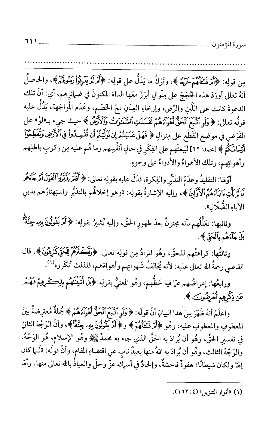 من قوله: (أَمْ تَسْأَلُهُمْ خَرْجاً)، وترك ما يدل على قوله: (أَمْ لَمْ يَعْرِفُوا رَسُولَهُمْ)، والحاصل أنه تعالى أورد هذه الحجج على منوالٍ أبرز معها الداء المكنون في ضمائرهم، أي: أن تلك الدعوة كانت على اللين والرفق، وإرخاء العنان مع الخصم، وعدم المواجهة، يدل عليه قوله تعالى: (وَلَوْ اتَّبَعَ الْحَقُّ أَهْوَاءَهُمْ لَفَسَدَتْ السَّمَوَاتُ وَالأَرْضُ) حيث جيء بـ"لوْ" على الفرض في موضع القطع على منوال (فَهَلْ عَسَيْتُمْ إِنْ تَوَلَّيْتُمْ أَنْ تُفْسِدُوا فِي الأَرْضِ وَتُقَطِّعُوا أَرْحَامَكُمْ) [محمد: 22] ليبعثهم على الفكر في حال أنفسهم وما هم عليه من ركوب باطلهم وأهوائهم، وتلك الأهواء والأدواء على وجوه.