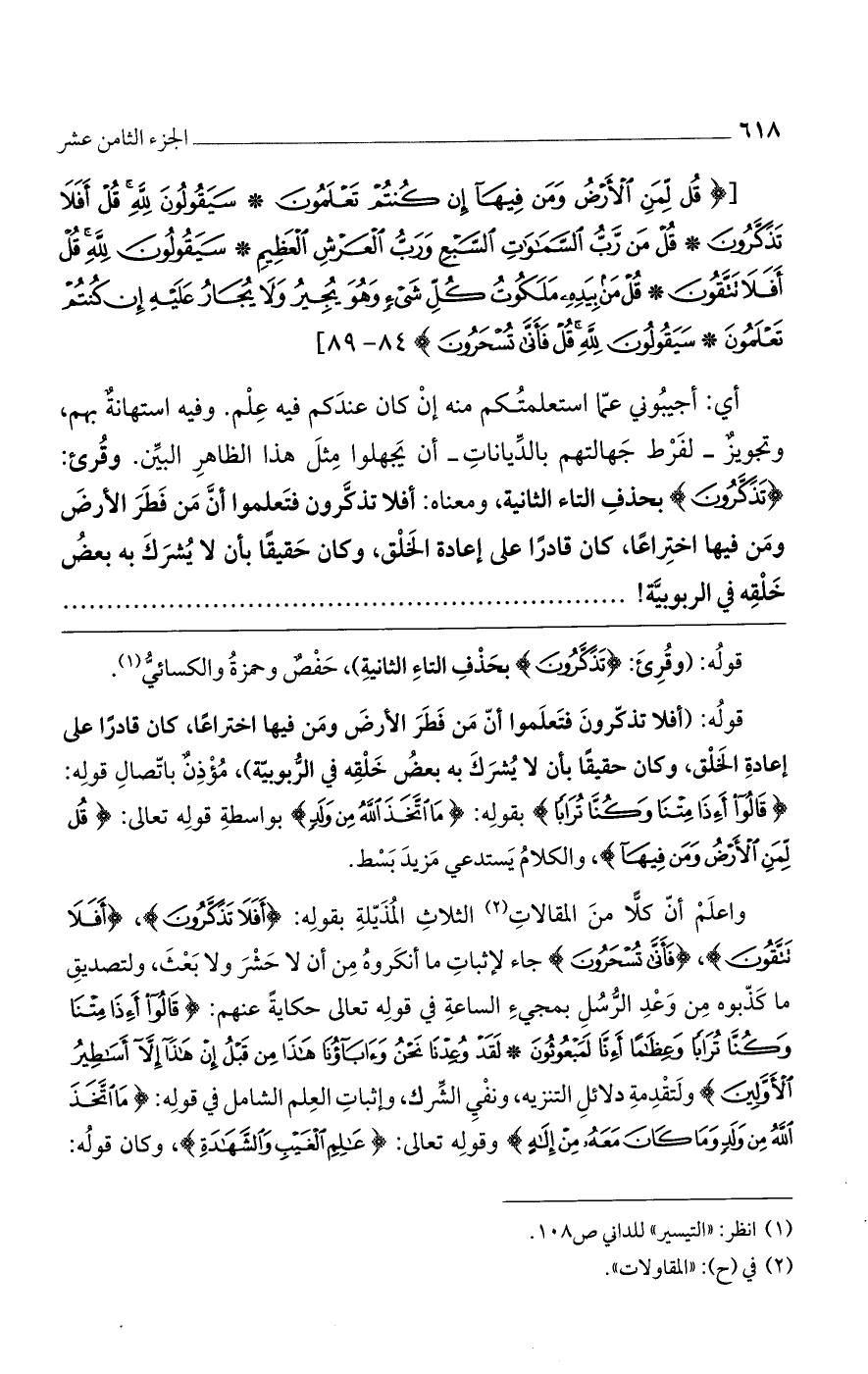 واعلم أن كلا من المقالات الثلاث المذيلة بقوله: (أَفَلا تَذَكَّرُونَ)، (أَفَلا تَتَّقُونَ)، (فَأَنَّا تُسْحَرُونَ) جاء لإثبات ما أنكروه من أن لا حشر ولا بعث، ولتصديق ما كذبوه من وعد الرسل بمجيء الساعة في قوله تعالى حكاية عنهم: (قَالُوا أَئِذَا مِتْنَا وَكُنَّا تُرَاباً وَعِظَاماً أَئِنَّا لَمَبْعُوثُونَ (82) لَقَدْ وُعِدْنَا نَحْنُ وَآبَاؤُنَا هَذَا مِنْ قَبْلُ إِنْ هَذَا إِلاَّ أَسَاطِيرُ الأَوَّلِينَ) ولتقدمه دلائل التنزيه، ونفي الشرك، وإثبات العلم الشامل في قوله: (مَا اتَّخَذَ اللَّهُ مِنْ وَلَدٍ وَمَا كَانَ مَعَهُ مِنْ إِلَهٍ) وقوله تعالى: (عَالِمِ الْغَيْبِ وَالشَّهَادَةِ)، وكان قوله: