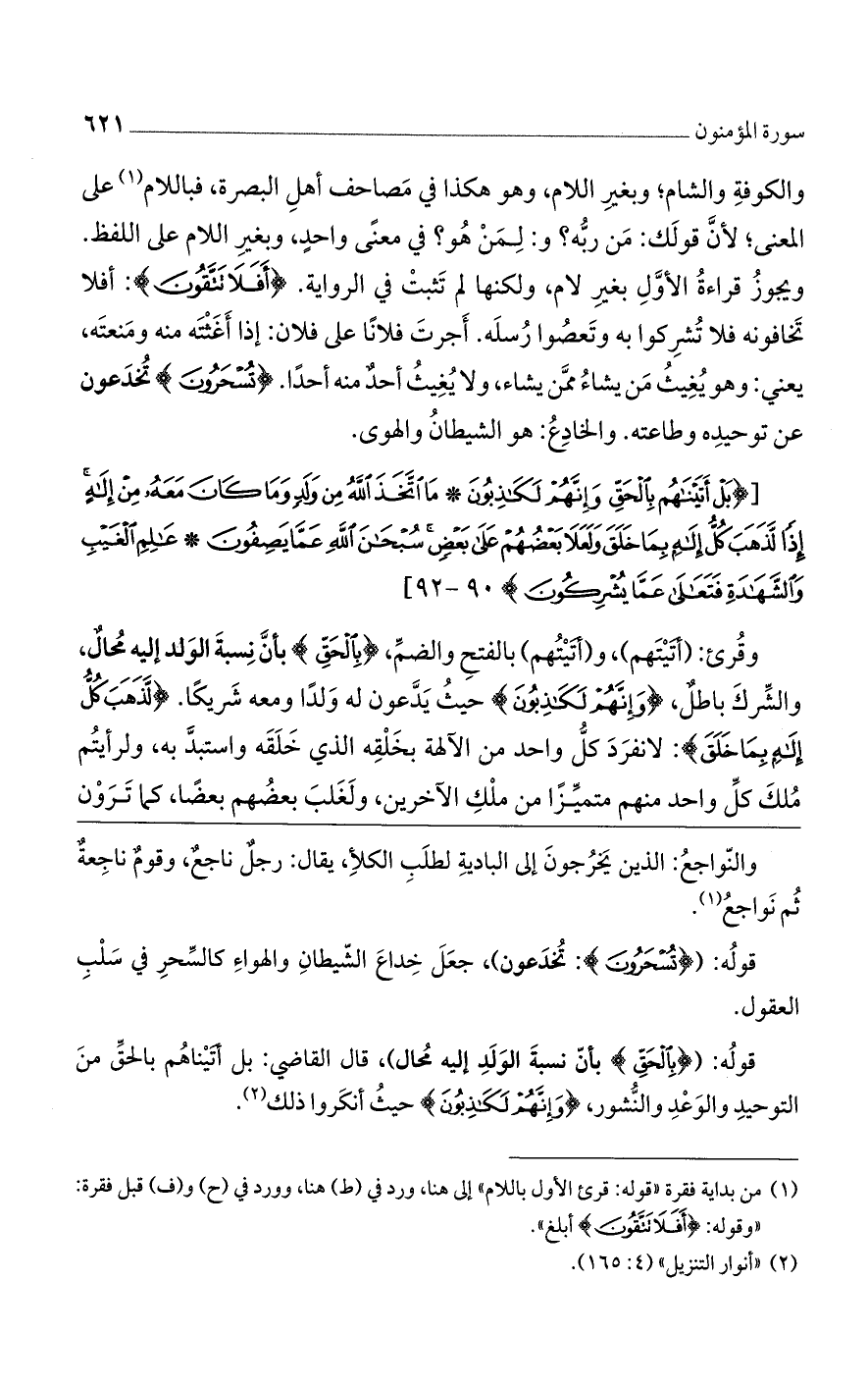 والكوفة والشام، وبغير اللام وهو هكذا في مصاحف أهل البصرة، فباللام على المعنى، لأن قولك من ربه، ولمن هو في معنى واحد، وبغير اللام على اللفظ. ويجوز قراءة الأوّل بغير لام، ولكنها لم تثبت في الرواية (أَفَلا تَتَّقُونَ) أفلا تخافونه فلا تشركوا به وتعصوا رسله. أجرت فلانا على فلان: إذا أغثته منه ومنعته، يعنى: وهو يغيث من يشاء ممن يشاء، ولا يغيث أحد منه أحدا (تُسْحَرُونَ) تخدعون عن توحيده وطاعته. والخادع: هو الشيطان والهوى.