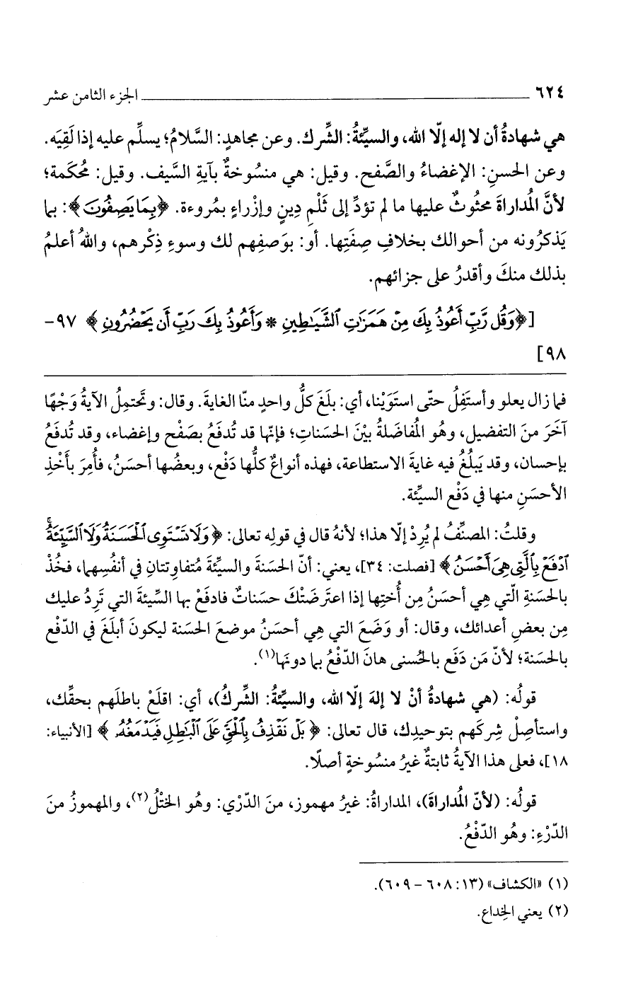 وقلت: المصنف لم يرد إلا هذا؛ لأنه قال في قوله تعالى: (وَلا تَسْتَوِي الْحَسَنَةُ وَلا السَّيِّئَةُ ادْفَعْ بِالَّتِي هِيَ أَحْسَنُ) [فصلت: 34]، يعني: أن الحسنة والسيئة متفاوتتان في أنفسهما، فخذ بالحسنة التي هي أحسن من أختها إذا اعترضتك حسناتٌ فادفع بها السيئة التي تردُ عليك من بعض أعدائك، وقال: أو وضع التي هي أحسن موضع الحسنة ليكون أبلغ في الدفع بالحسنة؛ لأن من دفع بالحسنى هان الدفع بما دونها.