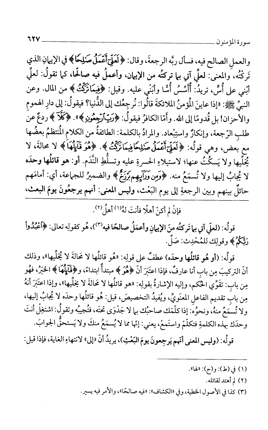 أسس أسا وأبنى عليه. وقيل: (فيما تركت) من المال. وعن النبي صلى الله عليه وسلم: «إذا عاين المؤمن الملائكة قالوا نرجعك إلى الدنيا، فيقول: إلى دار الهموم والأحزان! بل قدوما إلى الله. وأمّا الكافر فيقول: (رب ارجعون)» (كَلَّا) ردع عن طلب الرجعة، وإنكار واستبعاد. والمراد بالكلمة: الطائفة من الكلام المنتظم بعضها مع بعض، وهي قوله: (لَعَلِّي أَعْمَلُ صالِحاً فِيما تَرَكْتُ). (هُوَ قائِلُها) لا محالة، لا يخليها ولا يسكت عنها لاستيلاء الحسرة عليه وتسلط الندم. أو هو قائلها وحده لا يجاب إليها ولا تسمع منه (وَمِنْ وَرائِهِمْ بَرْزَخٌ) والضمير للجماعة، أى: أمامهم حائل بينهم وبين الرجعة إلى يوم البعث، وليس المعنى: أنهم يرجعون يوم البعث،