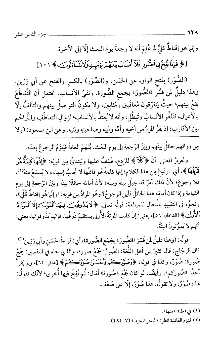 (الصور) بفتح الواو، عن الحسن. و (الصور) - بالكسر والفتح - عن أبى رزين. وهذا دليل لمن فسر "الصور" بجمع الصورة، ونفى الأنساب: يحتمل أنّ التقاطع يقع بينهم حيث يتفرّقون معاقبين ومثابين، ولا يكون التواصل بينهم والتألف إلا بالأعمال، فتلغوا الأنساب وتبطل، وأنه لا يعتدّ بالأنساب لزوال التعاطف والتراحم بين الأقارب، إذ يفرّ المرء من أخيه وأمّه وأبيه وصاحبته وبنيه. وعن ابن مسعود: (ولا