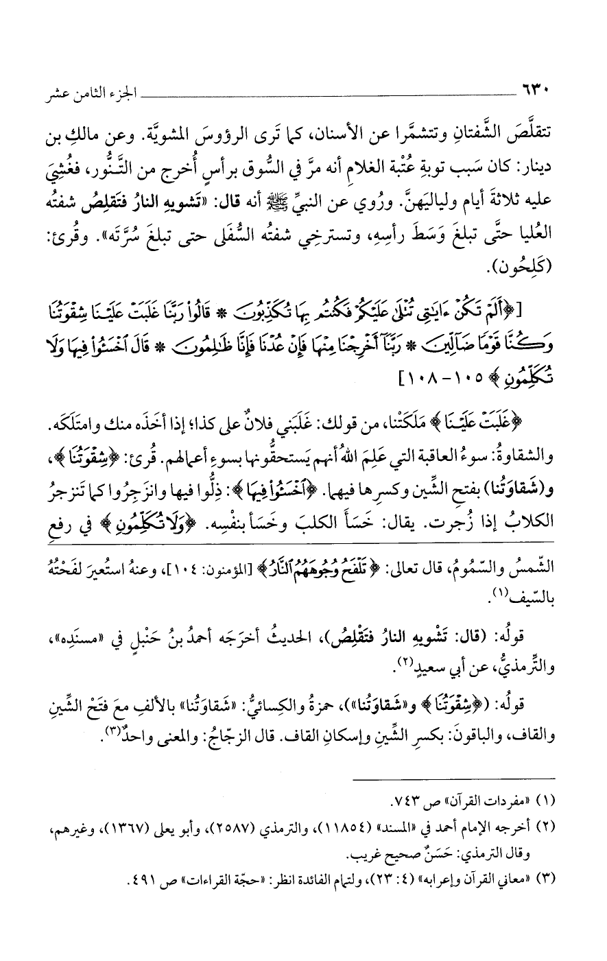 (غَلَبَتْ عَلَيْنا) ملكتنا، من قولك: غلبني فلان على كذا، إذا أخذه منك وامتلكه. والشقاوة سوء العاقبة التي علم الله أنهم يستحقونها بسوء أعمالهم. قرئ (شِقْوَتُنا) و (شقاوتنا) بفتح الشين وكسرها فيهما (اخْسَؤُا فِيها) ذلوا فيها وانزجروا كما تنزجر الكلاب إذا زجرت. يقال: خسأ الكلب وخسأ بنفسه. (وَلا تُكَلِّمُونِ) في رفع