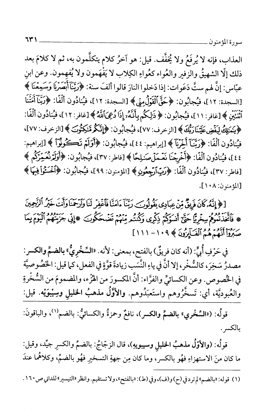 قوله: ("السخري" بالضم والكسر)، نافعٌ وحمزةُ والكسائيُّ: بالضمن والباقون: بالكسر.