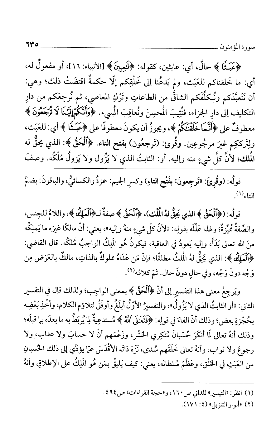 ويرجع معنى هذا التفسير إلى أن (الحق) بمعنى الواجب؛ ولذلك قال في التفسير الثاني: "أو الثابت الذي لا يزول"، التفسير الأول أبلغ وأوفق لتلاؤم الكلام، وأخذ بعضه بحجزة بعض؛ وذلك أن الفاء في قوله: (فَتَعَالَى اللَّهُ) مستدعية لما يربط به ما بعده بما قبله، وذلك أنه تعالى لما أنكر حُسبان منكري الحشر، وزعمهم أن لا حساب ولا عقاب، ولا رجوع ولا ثواب، وأنه تعالى خلقهم سُدى، نزه ذاته الأقدس عما يؤدي إلى ذلك الحسبان من العبث في الخلق، وعظم سلطانه، يعني: كيف يليق بمن هو الملك على الإطلاق وأنه