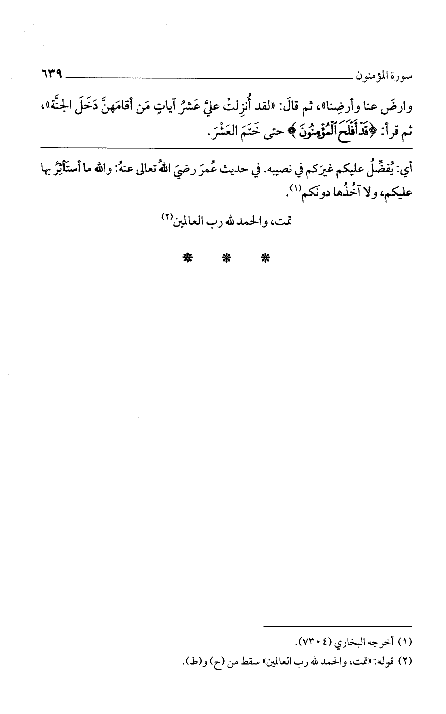 وارض عنا وأرضنا» ثم قال «لقد أنزلت علىّ عشر آيات من أقامهنّ دخل الجنة» ثم قرأ: (قَدْ أَفْلَحَ الْمُؤْمِنُونَ) حتى ختم العشر.
