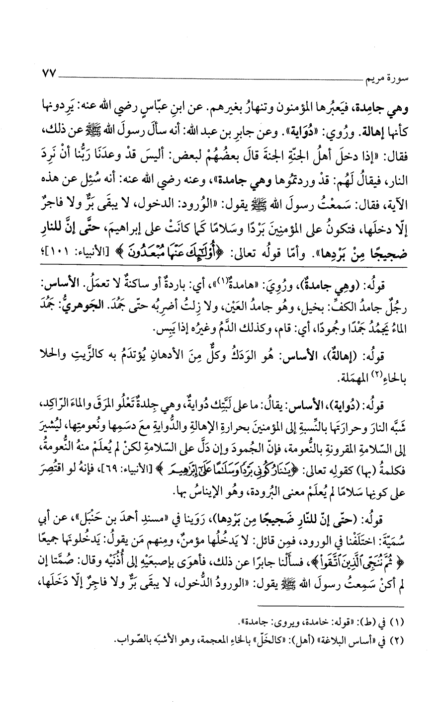 وهي جامدة، فيعبُرها المؤمنون وتنهار بغيرهم. عن ابن عباس رضى الله عنه: يردونها كأنها إهالة. وروى: "دواية". وعن جابر بن عبد الله أنه سأل رسول الله صلى الله عليه وسلم عن ذلك؟ فقال: "إذا دخل أهل الجنة الجنة قال بعضهم لبعض: أليس قد وعدنا ربنا أن نرد النار، فيقال لهم: قد وردتموها وهي جامدة". وعنه رضى الله عنه أنه سئل عن هذه الآية؟ فقال: سمعت رسول الله صلى الله عليه وسلم يقول: «الورود الدخول، لا يبقى برّ ولا فاجر إلا دخلها، فتكون على المؤمنين بردا وسلاما كما كانت على إبراهيم، حتى إنّ للنار ضجيجا من بردها» وأما قوله تعالى: (أُولئِكَ عَنْها مُبْعَدُونَ) [الأنبياء: 101]؛