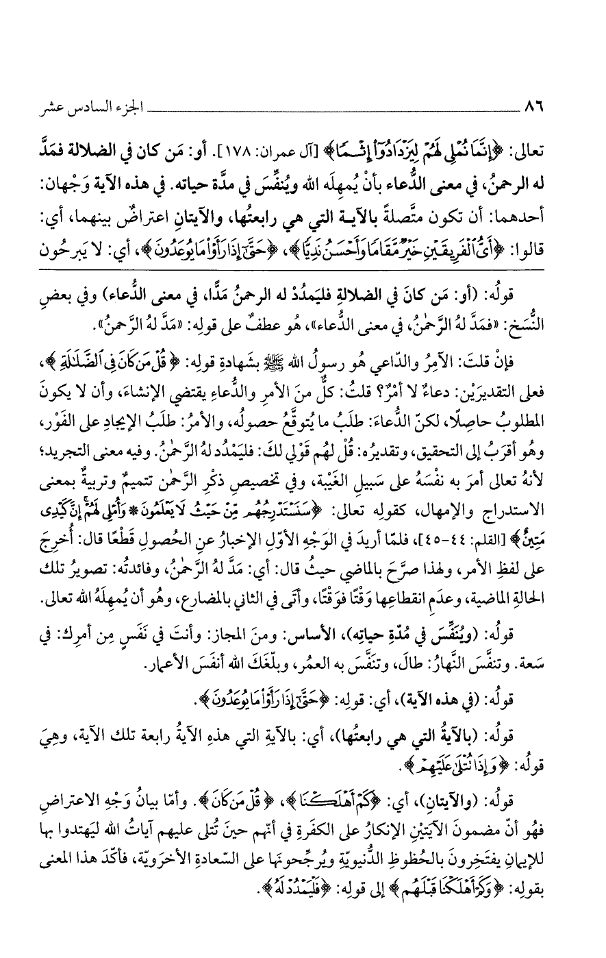 تعالى: (إِنَّما نُمْلِي لَهُمْ لِيَزْدادُوا إِثْماً) [آل عمران: 178]. أو: مَنْ كانَ فِي الضَّلالَةِ فَمد لَهُ الرَّحْمنُ، في معنى الدعاء بأن يمهله الله ويُنفس في مدّة حياته. في هذه الآية وجهان. أحدهما: أن تكون متصلة بالآية التي هي رابعتها، والآيتان اعتراض بينهما، أى قالوا: (أى الفريقين خير مقاما وأحسن نديا)، (حَتَّى إِذا رَأَوْا ما يُوعَدُونَ)، أى: لا يبرحون