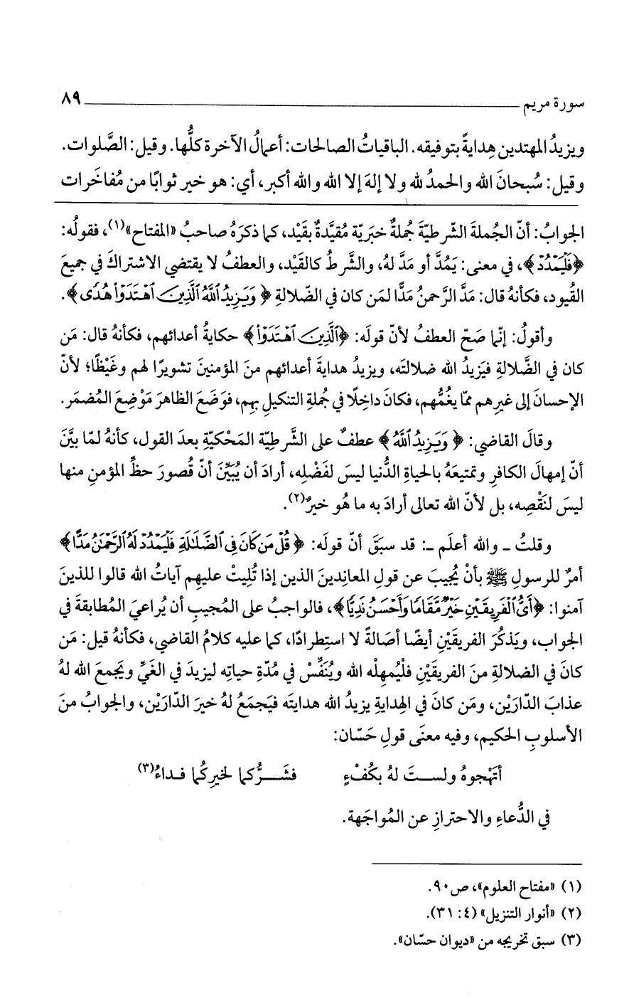 وقلتُ- والله أعلم-: قد سبق أن قوله: (قُلْ مَنْ كَانَ فِي الضَّلالَةِ فَلْيَمْدُدْ لَهُ الرَّحْمَنُ مَدّاً) أمرٌ للرسول صلى الله عليه وسلم بأن يجيب عن قول المعاندين الذين إذا تليت عليهم آيات الله قالوا للذين آمنوا: (أَيُّ الْفَرِيقَيْنِ خَيْرٌ مَقَاماً وَأَحْسَنُ نَدِيّاً)، فالواجبُ على المجيب أن يُراعي المطابقة في الجوابن ويذكر الفريقين أيضاً أصالة لا استطراداً، كما عليه كلام القاضي، فكأنه قيل: من كان في الضلالة من الفريقين فليمهله الله وينفس في مدة حياته ليزيد في الغي ويجمع الله له عذاب الدارين، ومن كان في الهداية يزيد الله هدايته فيجمع له خير الدارين، والجواب من الأسلوب الحكيم، وفيه معنى قول حسان: