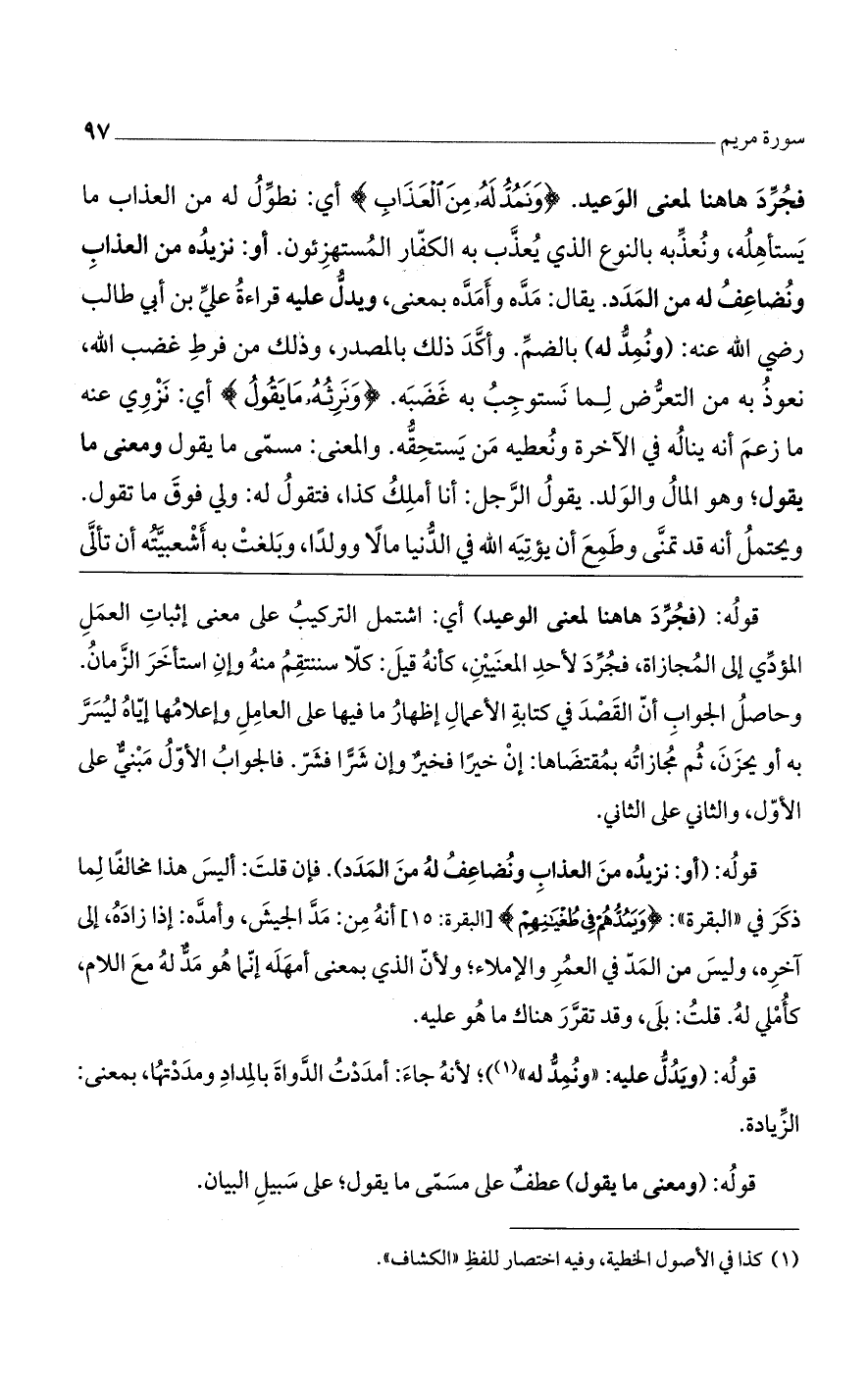 فجُرِّدَ هاهنا لمعنى الوعيد. (وَنَمُدُّ لَهُ مِنَ الْعَذابِ) أى: نطوّلُ له من العذاب ما يستأهله، ونعذبه بالنوع الذي يعذب به الكفار المستهزئون. أو: نزيدُه من العذاب ونضاعف له من المدد. يقال: مده وأمده بمعنى، ويدل عليه قراءة عليِّ بن أبى طالب رضي الله عنه: (ونمد له) بالضمِّ. وأكد ذلك بالمصدر، وذلك من فرط غضب الله، نعوذ به من التعرّض لما نستوجب به غضبه (وَنَرِثُهُ ما يَقُولُ) أى: نزوى عنه ما زعم أنه يناله في الآخرة ونعطيه من يستحقه. والمعنى مسمى ما يقول. ومعنى ما يَقُولُ وهو المال والولد. يقول الرجل: أنا أملك كذا، فتقول له: ولى فوق ما تقول، ويحتمل أنه قد تمنى وطمع أن يؤتيه الله في الدنيا مالا وولدا، وبلغت به أشعبيته أن تألَّى