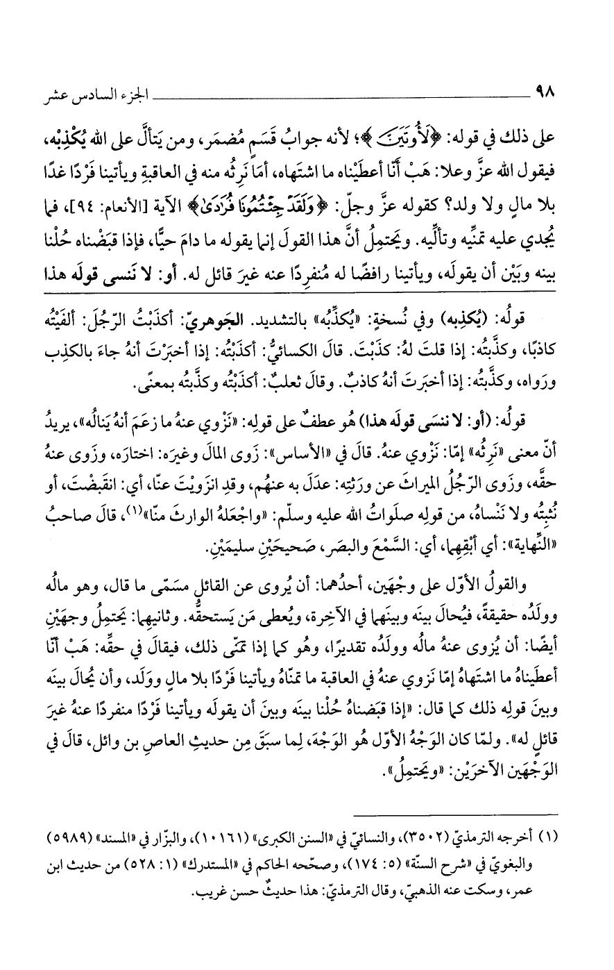 والقول الأول على وجهين، أحدهما: أن يُروى عن القائل مسمى ما قال، وهو ماله ولده حقيقة، يحال بينه وبينهما في الآخرة، ويعطى من يستحقه. وثانيهما: يحتمل وجهين أيضاً: أن يُزوى عنه ماله وولده تقديراًن وهو كما إذا تمنى ذلك، فيقال في حقه: هب أنا اعطيناه ما اشتهاه إما نزوي عنه في العاقبة ما تمناه ويأتينا فرداً بلا مال وولد، وان يُحال بينه وبين قوله ذلك ما قال: "إذا قبضناه حُلنا بينه وبين أن يقوله ويأتينا فرداً منفرداً عنه غير قائل له". ولما كان الوجه الأول هو الوجه، لما سبق من حديث العاص بن وائل، قال في الوجهين الآخرين: "ويحتملُ".