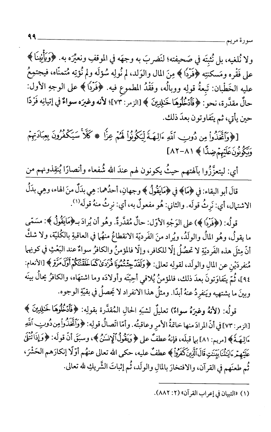 قوله: ((فَرْداً) على الوجه الأول: حالٌ مقدرةٌ. وهو أن يُراد بـ (مَا يَقُولُ): مسمى ما يقولُ، وهو المال والولد، ويُراد من الفردية الانقطاع منهما في العاقبة بالكلية، ولا شك أن مثل هذه الفردية لا تحصل إلا للكافر، وغلا فالمؤمن والكافر سواءٌ عند البعث في كونهما منفردين عن المال والولد، لقوله تعالى: (وَلَقَدْ جِئْتُمُونَا فُرَادَى كَمَا خَلَقْنَاكُمْ أَوَّلَ مَرَّةٍ) [الأنعام: 94]، ثم يتفاوتون بعد ذلك، فالمؤمن يلاقي أحبته وأولاده وما اشتهاه، والكافر يحالُ بينه وبين ما يشتهيه وينفرد عنه أبداً. ومثلُ هذا الانفراد لا يحصل في بقية الوجوه.