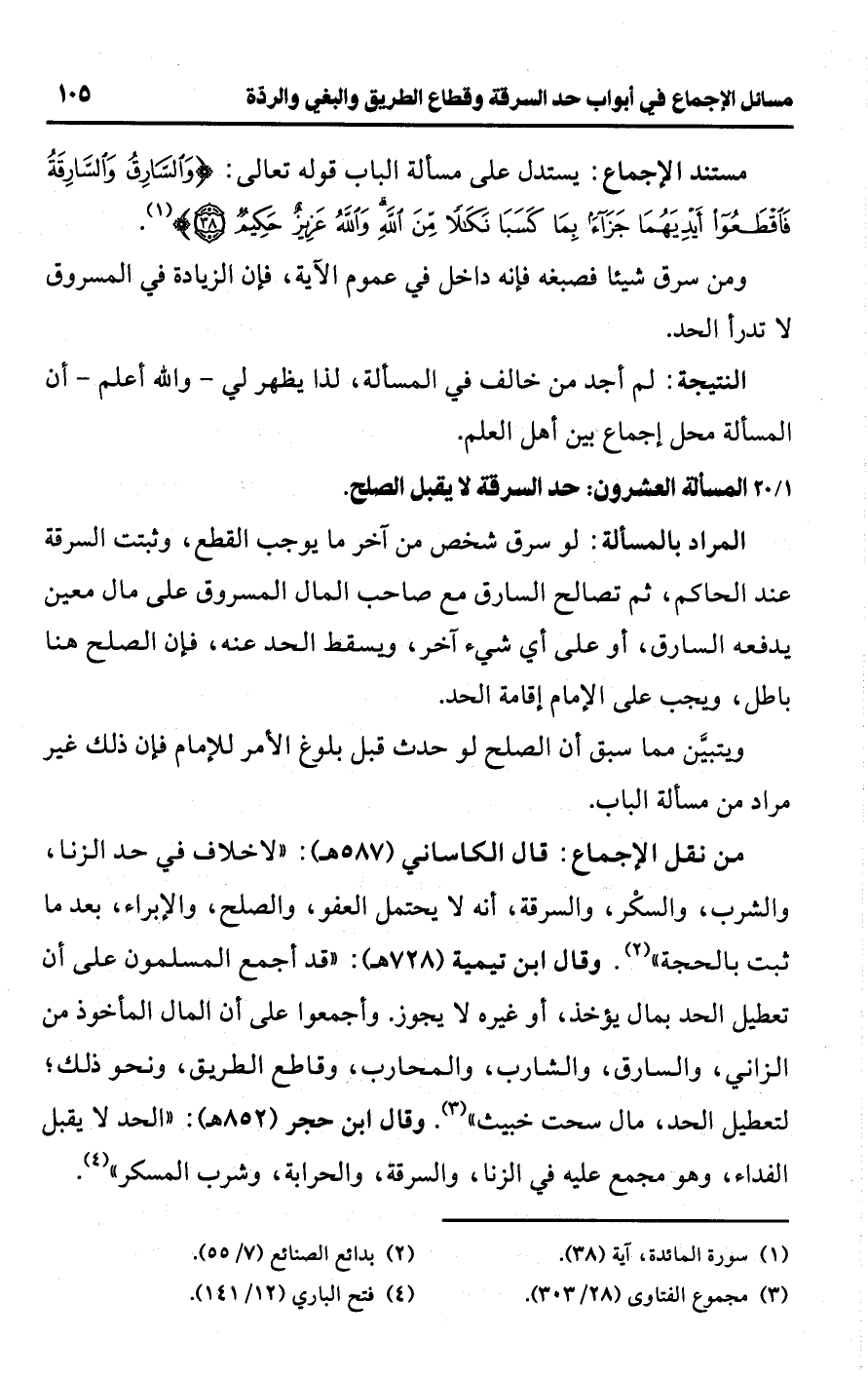 • مستند الإجماع: يستدل على مسألة الباب قوله تعالى: {وَالسَّارِقُ وَالسَّارِقَةُ فَاقْطَعُوا أَيْدِيَهُمَا جَزَاءً بِمَا كَسَبَا نَكَالًا مِنَ اللَّهِ وَاللَّهُ عَزِيزٌ حَكِيمٌ (38)} (¬1).