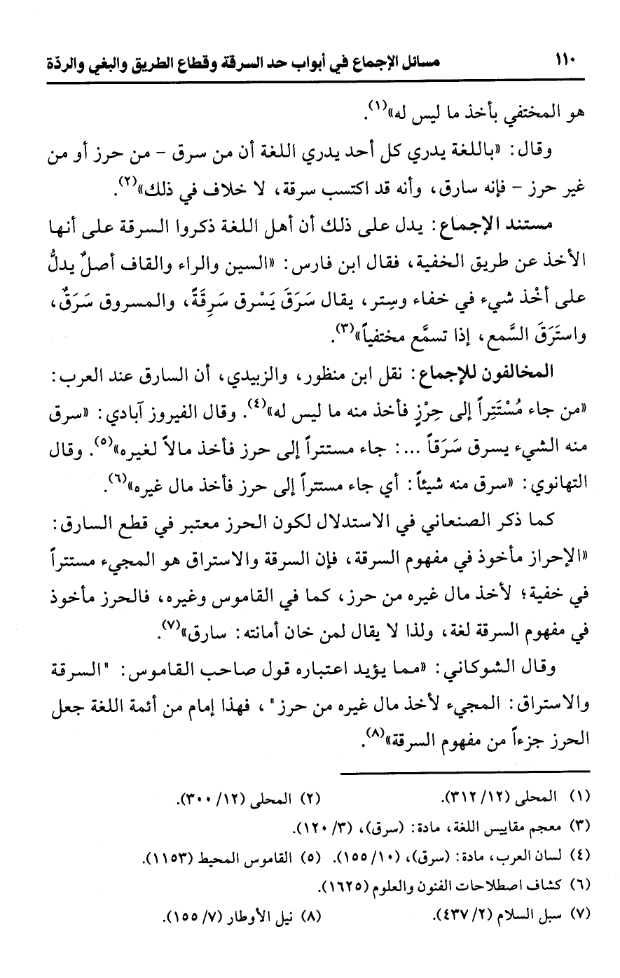 • المخالفون للإجماع: نقل ابن منظور، والزبيدي، أن السارق عند العرب: "من جاء مُسْتَتِرًا إلى حِرْزٍ فأخذ منه ما ليس له" (¬4). وقال الفيروزآبادي: "سرق منه الشيء يسرق سَرَقًا. . .: جاء مستترًا إلى حرز فأخذ مالًا لغيره" (¬5). وقال التهانوي: "سرق منه شيئًا: أي جاء مستترًا إلى حرز فأخذ مال غيره" (¬6).