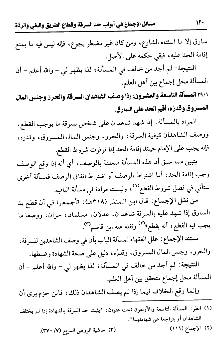 (¬1) انظر: المسألة التاسعة والأربعون تحت عنوان: "يثبت حد السرقة بالشهادة إذا لم يختلف الشاهدان أو يتراجعا عن شهادتهما".