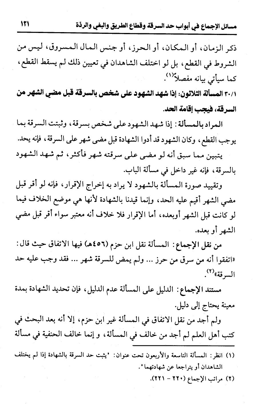 (¬1) انظر: المسألة التاسعة والأربعون تحت عنوان: "يثبت حد السرقة بالشهادة إذا لم يختلف الشاهدان أو يتراجعا عن شهادتهما".