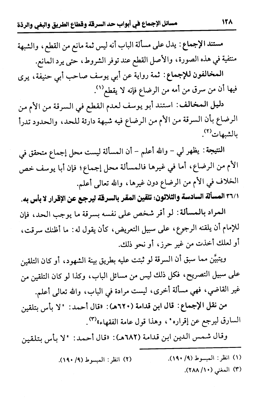 • من نقل الإجماع: قال ابن قدامة (620 هـ): "قال أحمد: "لا بأس بتلقين السارق ليرجع عن إقراره"، وهذا قول عامة الفقهاء" (¬3).