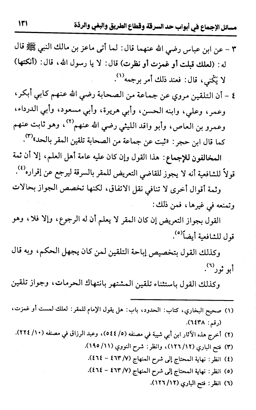 • المخالفون للإجماع: هذا القول وإن كان عليه عامة أهل العلم، إلا أن ثمة قولًا للشافعية أنه لا يجوز للقاضي التعريض للمقر بالسرقة ليرجع عن إقراره (¬4).