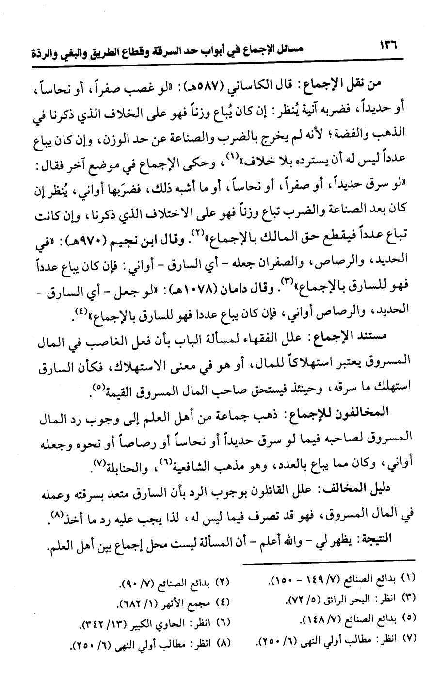 • من نقل الإجماع: قال الكاساني (587 هـ): "لو غصب صفرًا، أو نحاسًا، أو حديدًا، فضربه آنية يُنظر: إن كان يُباع وزنًا فهو على الخلاف الذي ذكرنا في الذهب والفضة؛ لأنه لم يخرج بالضرب والصناعة عن حد الوزن، وإن كان يباع عددًا ليس له أن يسترده بلا خلاف" (¬1)، وحكى الإجماع في موضع آخر فقال: "لو سرق حديدًا، أو صفرًا، أو نحاسًا، أو ما أشبه ذلك، فضرَبها أواني، يُنظر إن كان بعد الصناعة والضرب تباع وزنًا فهو على الاختلاف الذي ذكرنا، وإن كانت تباع عددًا فيقطع حق المالك بالإجماع" (¬2). وقال ابن نجيم (970 هـ): "في الحديد، والرصاص، والصفران جعله -أي السارق- أواني: فمان كان يباع عددًا فهو للسارق بالإجماع" (¬3). وقال دامان (1078 هـ): "لو جعل -أي السارق- الحديد، والرصاص أواني، فإن كان يباع عددا فهو للسارق بالإجماع" (¬4).