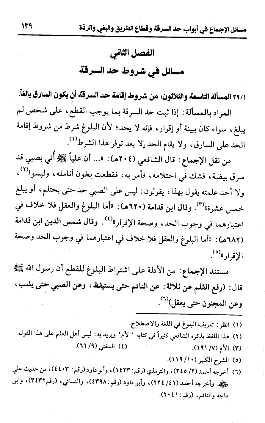 • من نقل الإجماع: قال الشافعي (204 هـ): ". . . أن عليًا -رضي اللَّه عنه- أُتي بصبي قد سرق بيضة، فشك في احتلامه، فأمر به، فقطعت بطون أنامله، وليسوا (¬2)، ولا أحد علمته يقول بهذا، يقولون: ليس على الصبي حد حتى يحتلم، أو يبلغ خمس عشرة" (¬3). وقال ابن قدامة (620 هـ): "أما البلوغ والعقل فلا خلاف في اعتبارهما في وجوب الحد، وصحة الإقرار" (¬4). وقال شمس الدين ابن قدامة (682 هـ): "أما البلوغ والعقل فلا خلاف في اعتبارهما في وجوب الحد وصحة الإقرار" (¬5).