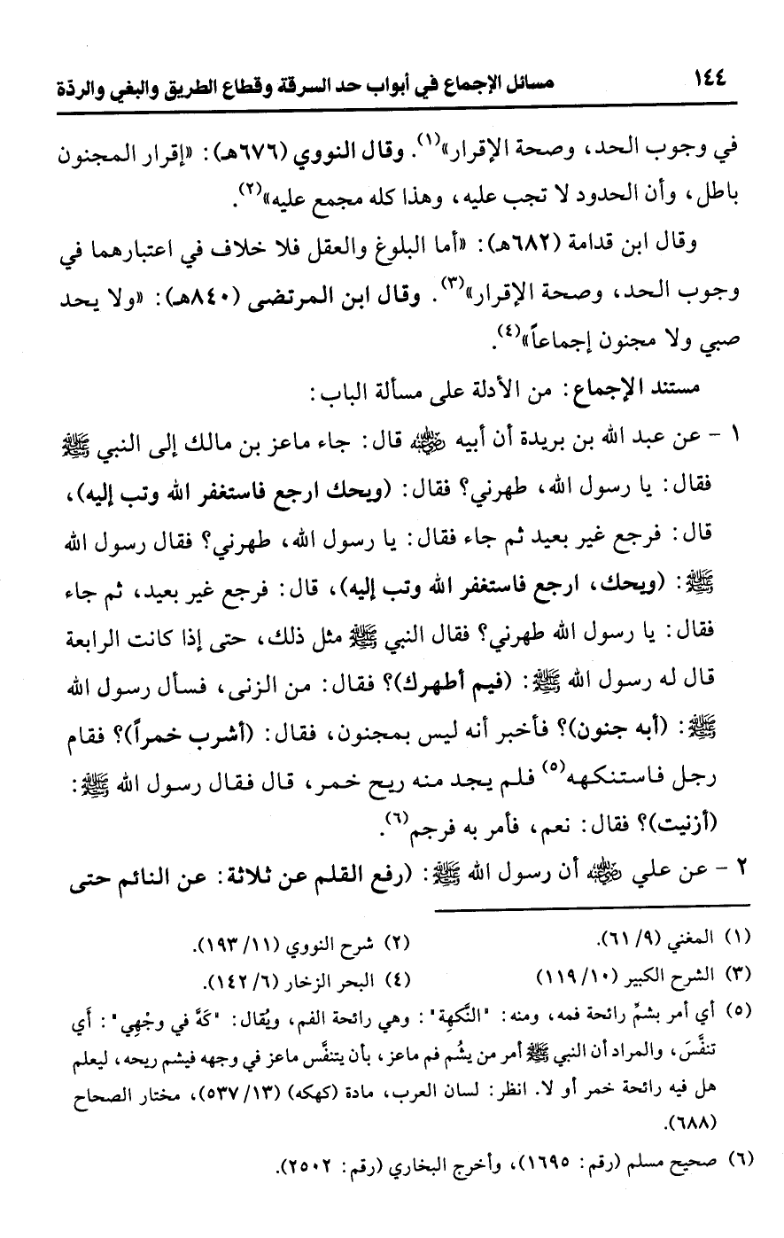 وقال ابن قدامة (682 هـ): "أما البلوغ والعقل فلا خلاف في اعتبارهما في وجوب الحد، وصحة الإقرار" (¬3). وقال ابن المرتضى (840 هـ): "ولا يحد صبي ولا مجنون إجماعًا" (¬4).