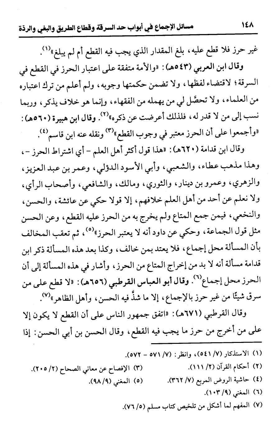 وقال ابن العربي (543 هـ): "والأمة متفقة على اعتبار الحرز في القطع في السرقة؛ لاقتضاء لفظها، ولا تضمن حكمتها وجوبه، ولم أعلم من ترك اعتباره من العلماء، ولا تحصَّل لي من يهمله من الفقهاء، وإنما هو خلاف يذكر، وربما نسب إلى من لا قدر له، فلذلك أعرضت عن ذكره" (¬2). وقال ابن هبيرة (560 هـ): "وأجمعوا على أن الحرز معتبر في وجوب القطع" (¬3) ونقله عنه ابن قاسم (¬4).