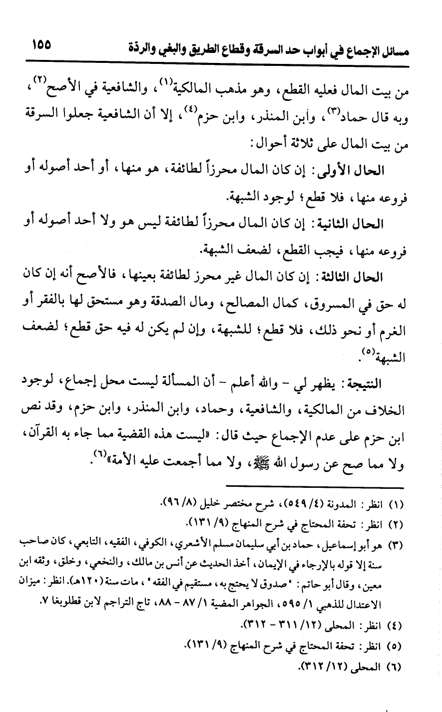الحال الثالثة: إن كان المال غير محرز لطائفة بعينها، فالأصح أنه إن كان له حق في المسروق، كمال المصالح، ومال الصدقة وهو مستحق لها بالفقر أو الغرم أو نحو ذلك، فلا قطع؛ للشبهة، وإن لم يكن له فيه حق قطع؛ لضعف الشبهة (¬5).Rيظهر لي -واللَّه أعلم- أن المسألة ليست محل إجماع، لوجود الخلاف من المالكية، والشافعية، وحماد، وابن المنذر، وابن حزم، وقد نص ابن حزم على عدم الإجماع حيث قال: "ليست هذه القضية مما جاء به القرآن، ولا مما صح عن رسول اللَّه -صلى اللَّه عليه وسلم-، ولا مما أجمعت عليه الأمة" (¬6).
