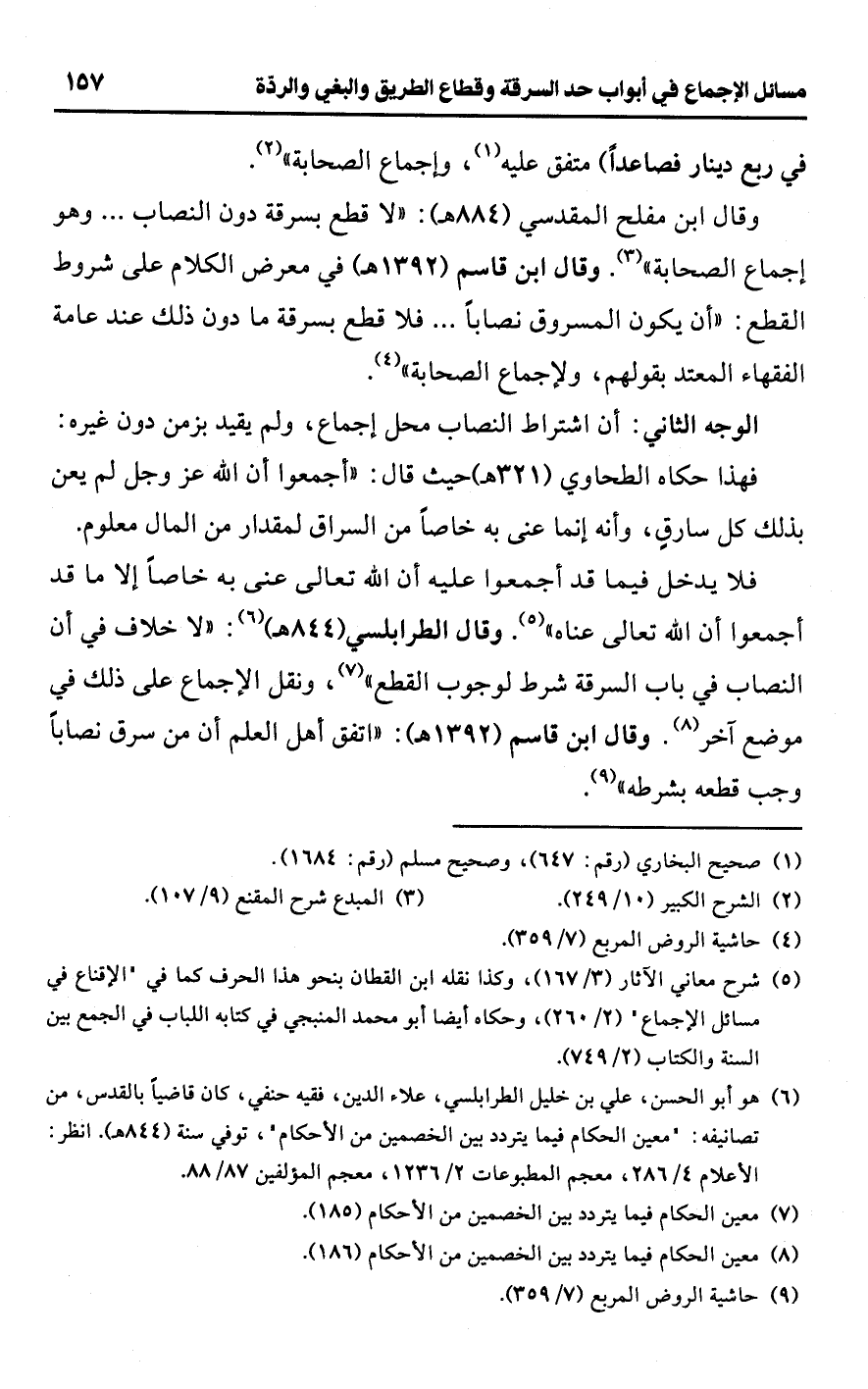 فلا يدخل فيما قد أجمعوا عليه أن اللَّه تعالى عنى به خاصًا إلا ما قد أجمعوا أن اللَّه تعالى عناه" (¬5). وقال الطرابلسي (844 هـ) (¬6): "لا خلاف في أن النصاب في باب السرقة شرط لوجوب القطع" (¬7)، ونقل الإجماع على ذلك في موضع آخر (¬8). وقال ابن قاسم (1392 هـ): "اتفق أهل العلم أن من سرق نصابًا وجب قطعه بشرطه" (¬9).