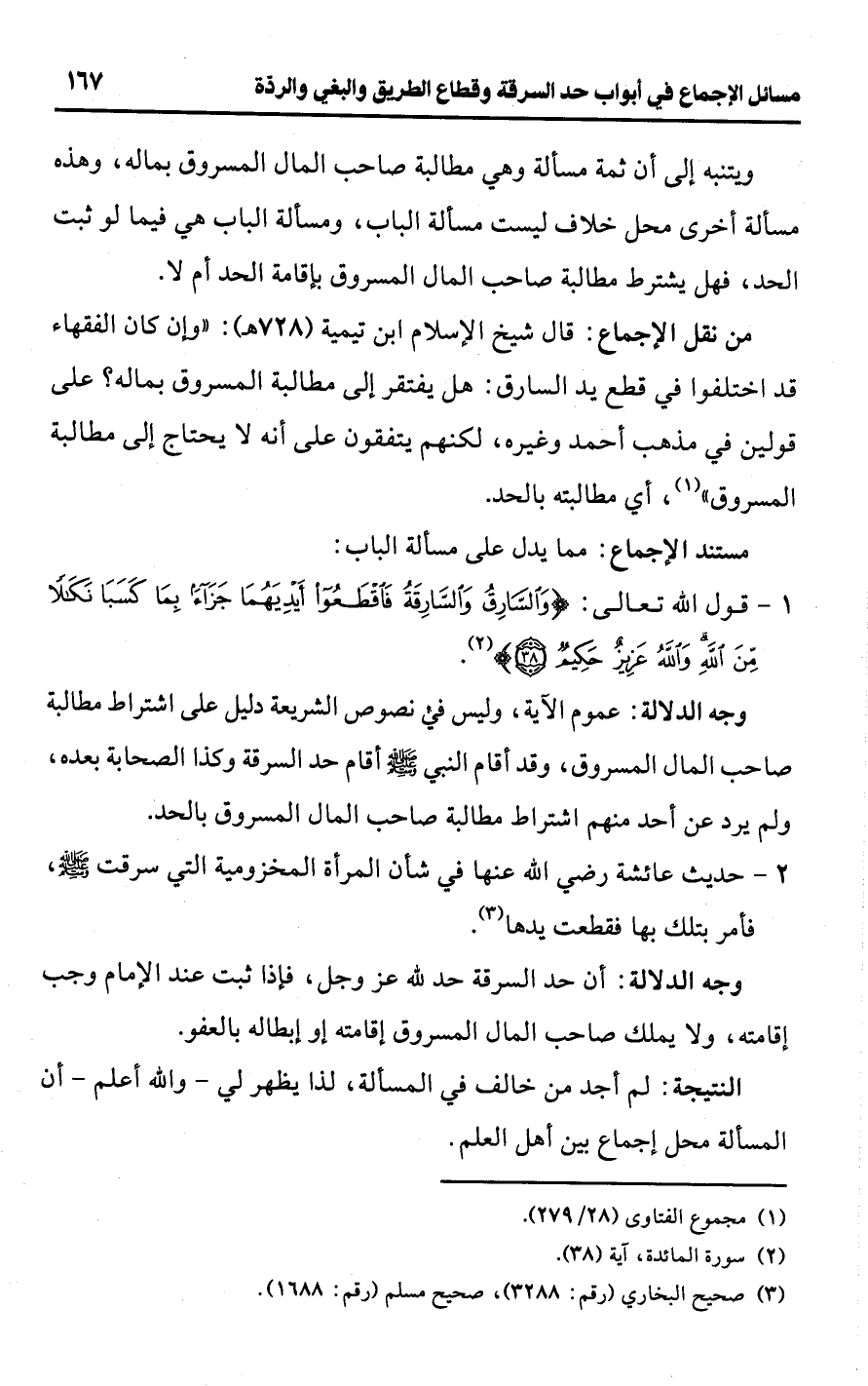 • من نقل الإجماع: قال شيخ الإسلام ابن تيمية (728 هـ): "وإن كان الفقهاء قد اختلفوا في قطع يد السارق: هل يفتقر إلى مطالبة المسروق بماله؟ على قولين في مذهب أحمد وغيره، لكنهم يتفقون على أنه لا يحتاج إلى مطالبة المسروق" (¬1)، أي مطالبته بالحد.