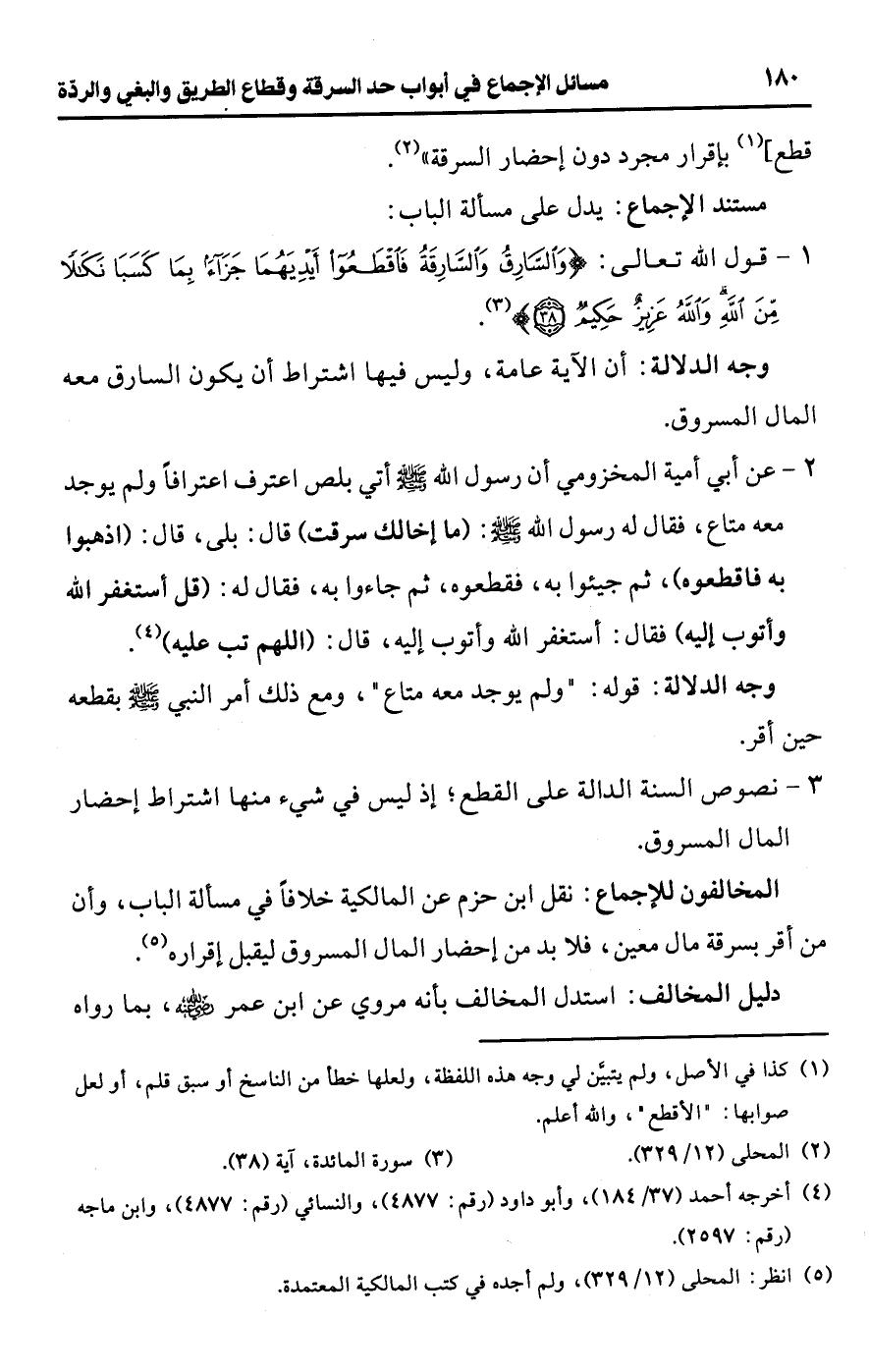 • المخالفون للإجماع: نقل ابن حزم عن المالكية خلافًا في مسألة الباب، وأن من أقر بسرقة مال معين، فلا بد من إحضار المال المسروق ليقبل إقراره (¬5).