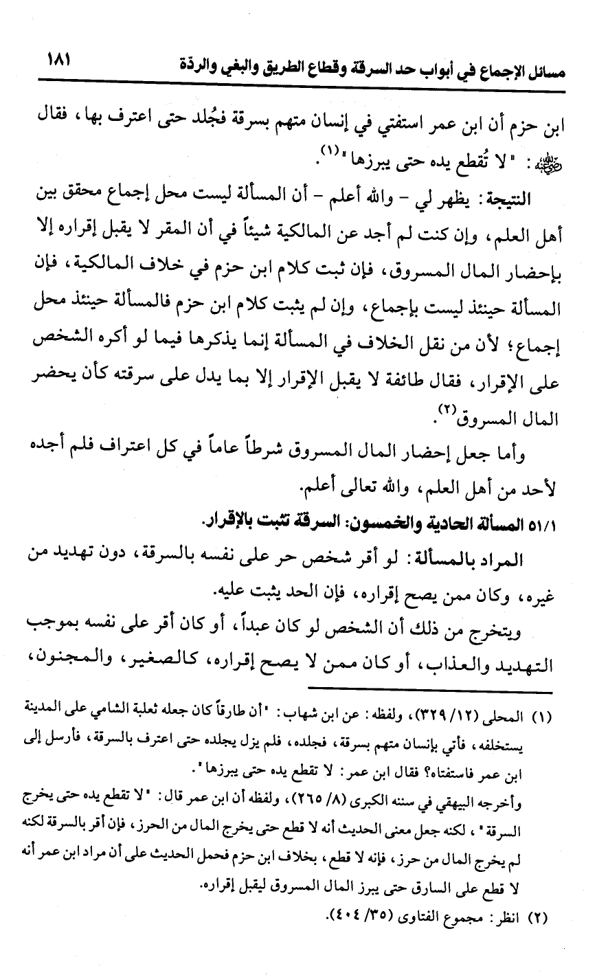 ابن حزم أن ابن عمر استفتي في إنسان متهم بسرقة فجُلد حتى اعترف بها، فقال -رضي اللَّه عنه-: "لا تُقطع يده حتى يبرزها" (¬1).Rيظهر لي -واللَّه أعلم- أن المسألة ليست محل إجماع محقق بين أهل العلم، وإن كنت لم أجد عن المالكية شيئًا في أن المقر لا يقبل إقراره إلا بإحضار المال المسروق، فإن ثبت كلام ابن حزم في خلاف المالكية، فإن المسألة حينئذ ليست بإجماع، وإن لم يثبت كلام ابن حزم فالمسألة حينئذ محل إجماع؛ لأن من نقل الخلاف في المسألة إنما يذكرها فيما لو أكره الشخص على الإقرار، فقال طائفة لا يقبل الإقرار إلا بما يدل على سرقته كأن يحضر المال المسروق (¬2).