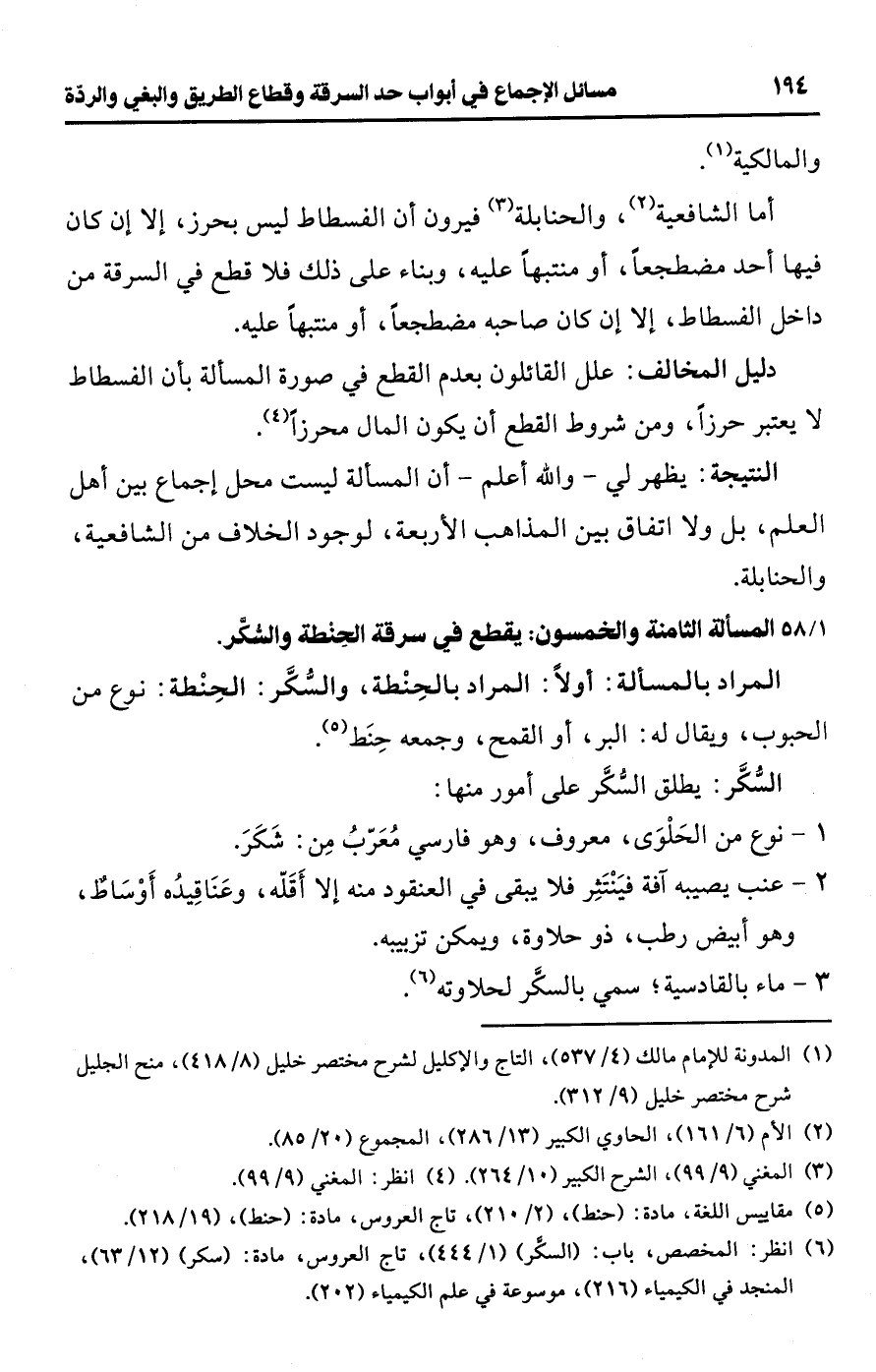 [58/ 1] المسألة الثامنة والخمسون: يقطع في سرقة الحِنْطة والسُّكَّر.