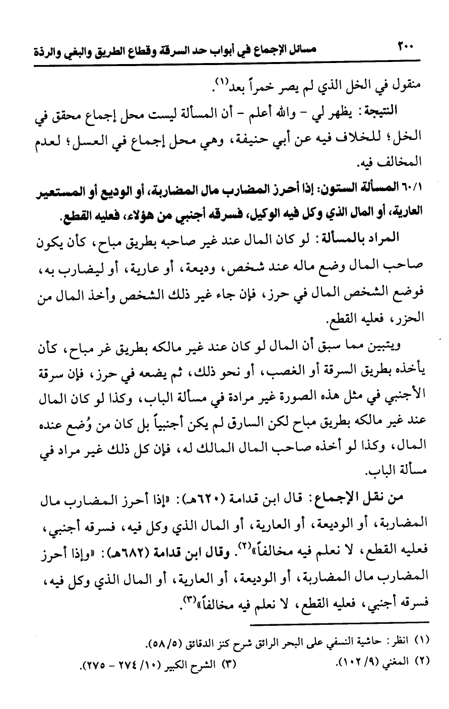 • من نقل الإجماع: قال ابن قدامة (620 هـ): "إذا أحرز المضارب مال المضاربة، أو الوديعة، أو العارية، أو المال الذي وكل فيه، فسرقه أجنبي، فعليه القطع، لا نعلم فيه مخالفًا" (¬2). وقال ابن قدامة (682 هـ): "وإذا أحرز المضارب مال المضاربة، أو الوديعة، أو العارية، أو المال الذي وكل فيه، فسرقه أجنبي، فعليه القطع، لا نعلم فيه مخالفًا" (¬3).