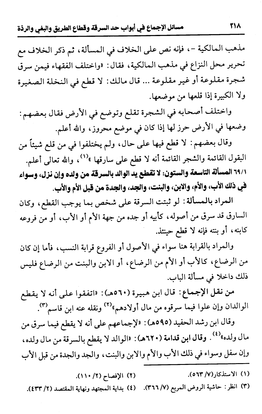 • من نقل الإجماع: قال ابن هبيرة (560 هـ): "اتفقوا على أنه لا يقطع الوالدان وإن علوا فيما سرقوه من مال أولادهم" (¬2) ونقله عنه ابن قاسم (¬3).