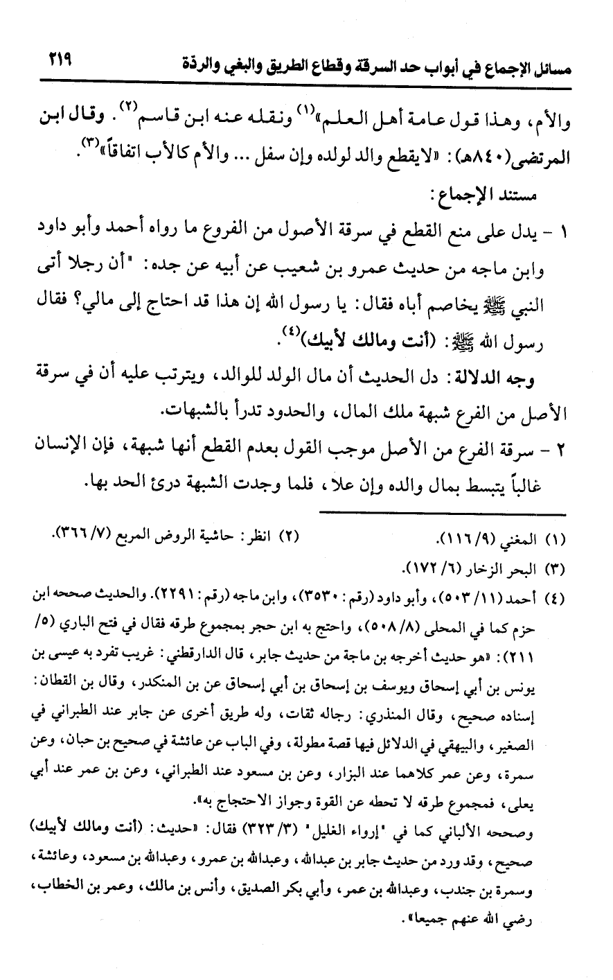 1 - يدل على منع القطع في سرقة الأصول من الفروع ما رواه أحمد وأبو داود وابن ماجه من حديث عمرو بن شعيب عن أبيه عن جده: "أن رجلا أتى النبي -صلى اللَّه عليه وسلم- يخاصم أباه فقال: يا رسول اللَّه إن هذا قد احتاج إلى مالي؟ فقال رسول اللَّه -صلى اللَّه عليه وسلم-: (أنت ومالك لأبيك) (¬4).