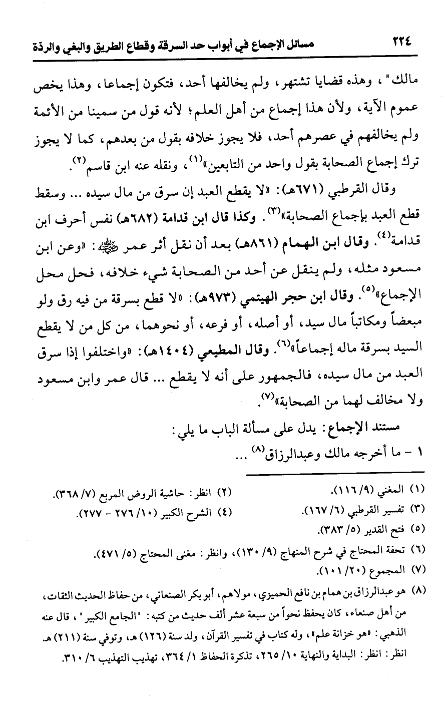 وقال القرطبي (671 هـ): "لا يقطع العبد إن سرق من مال سيده. . . وسقط قطع العبد بإجماع الصحابة" (¬3). وكذا قال ابن قدامة (682 هـ) نفس أحرف ابن قدامة (¬4). وقال ابن الهمام (861 هـ) بعد أن نقل أثر عمر -رضي اللَّه عنه-: "وعن ابن مسعود مثله، ولم ينقل عن أحد من الصحابة شيء خلافه، فحل محل الإجماع" (¬5). وقال ابن حجر الهيتمي (973 هـ): "لا قطع بسرقة من فيه رق ولو مبعضًا ومكاتبًا مال سيد، أو أصله، أو فرعه، أو نحوهما، من كل من لا يقطع السيد بسرقة ماله إجماعًا" (¬6). وقال المطيعي (1404 هـ): "واختلفوا إذا سرق العبد من مال سيده، فالجمهور على أنه لا يقطع. . . قال عمر وابن مسعود ولا مخالف لهما من الصحابة" (¬7).