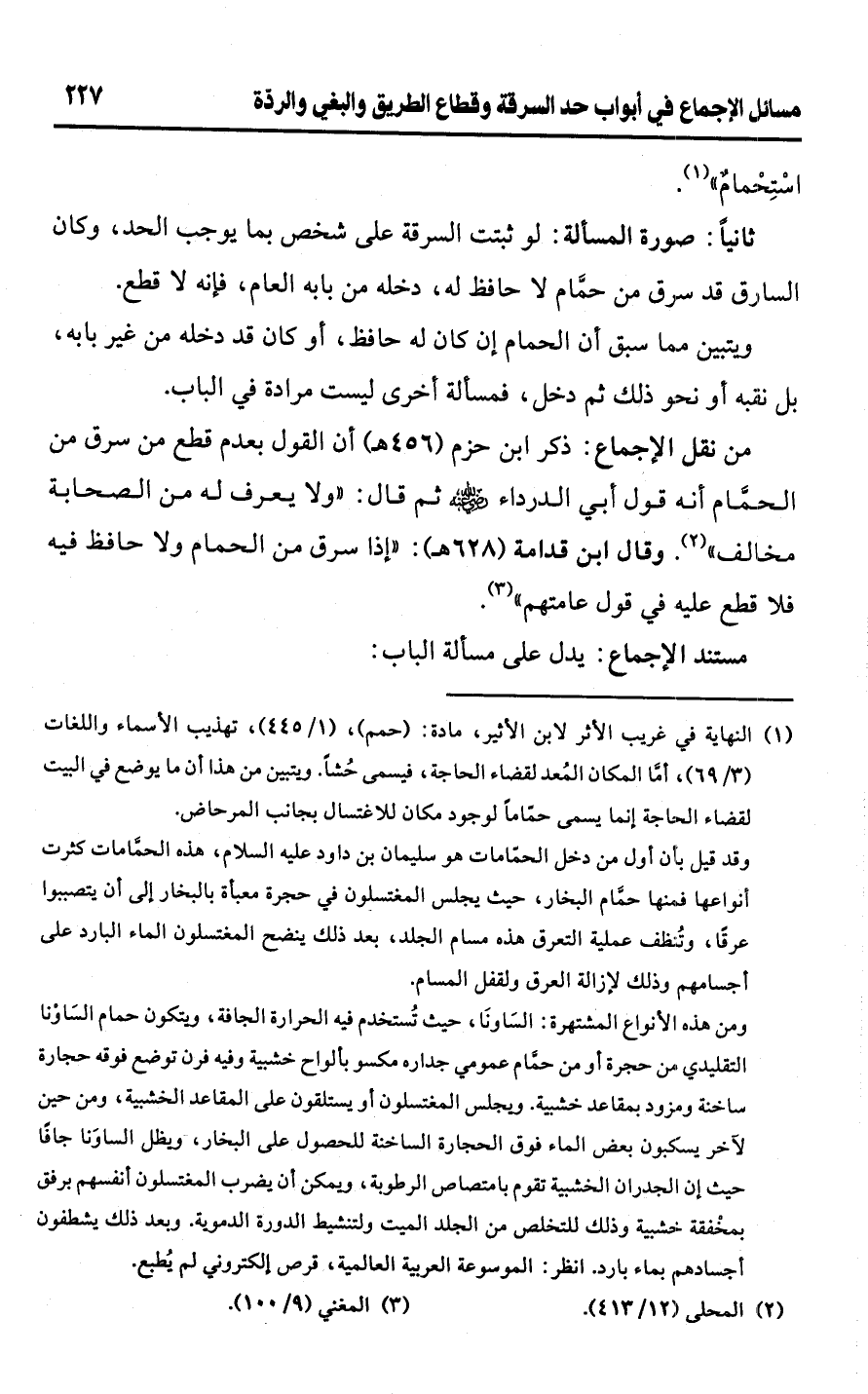 • من نقل الإجماع: ذكر ابن حزم (456 هـ) أن القول بعدم قطع من سرق من الحمَّام أنه قول أبي الدرداء -رضي اللَّه عنه- ثم قال: "ولا يعرف له من الصحابة مخالف" (¬2). وقال ابن قدامة (628 هـ): "إذا سرق من الحمام ولا حافظ فيه فلا قطع عليها في قول عامتهم" (¬3).