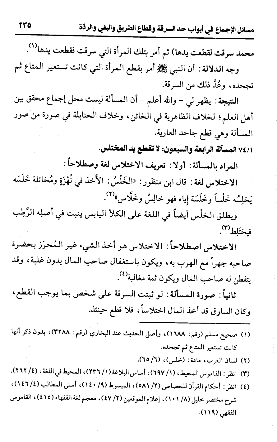 [74/ 1] المسألة الرابعة والسبعون: لا تقطع يد المختلس.