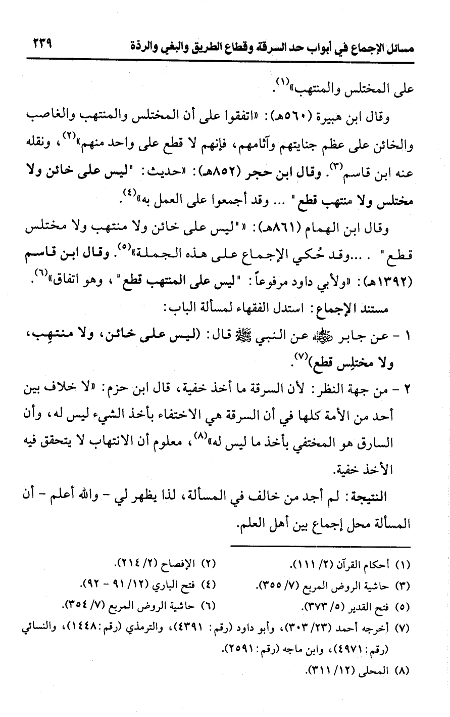 وقال ابن هبيرة (560 هـ): "اتفقوا على أن المختلس والمنتهب والغاصب والخائن على عظم جنايتهم وآثامهم، فإنهم لا قطع على واحد منهم" (¬2)، ونقله عنه ابن قاسم (¬3). وقال ابن حجر (852 هـ): "حديث: "ليس على خائن ولا مختلس ولا منتهب قطع". . . وقد أجمعوا على العمل به" (¬4).