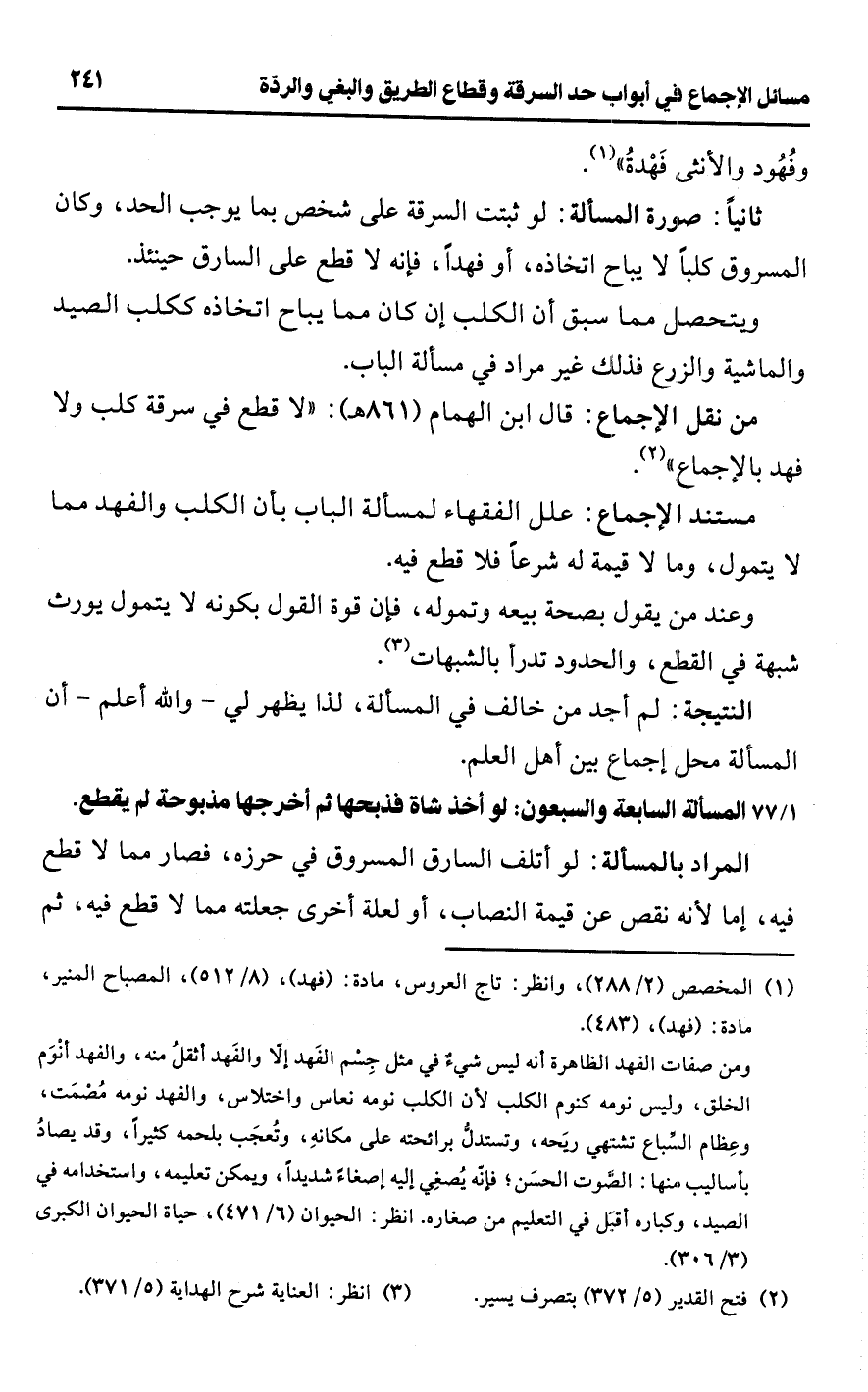 • من نقل الإجماع: قال ابن الهمام (861 هـ): "لا قطع في سرقة كلب ولا فهد بالإجماع" (¬2).
